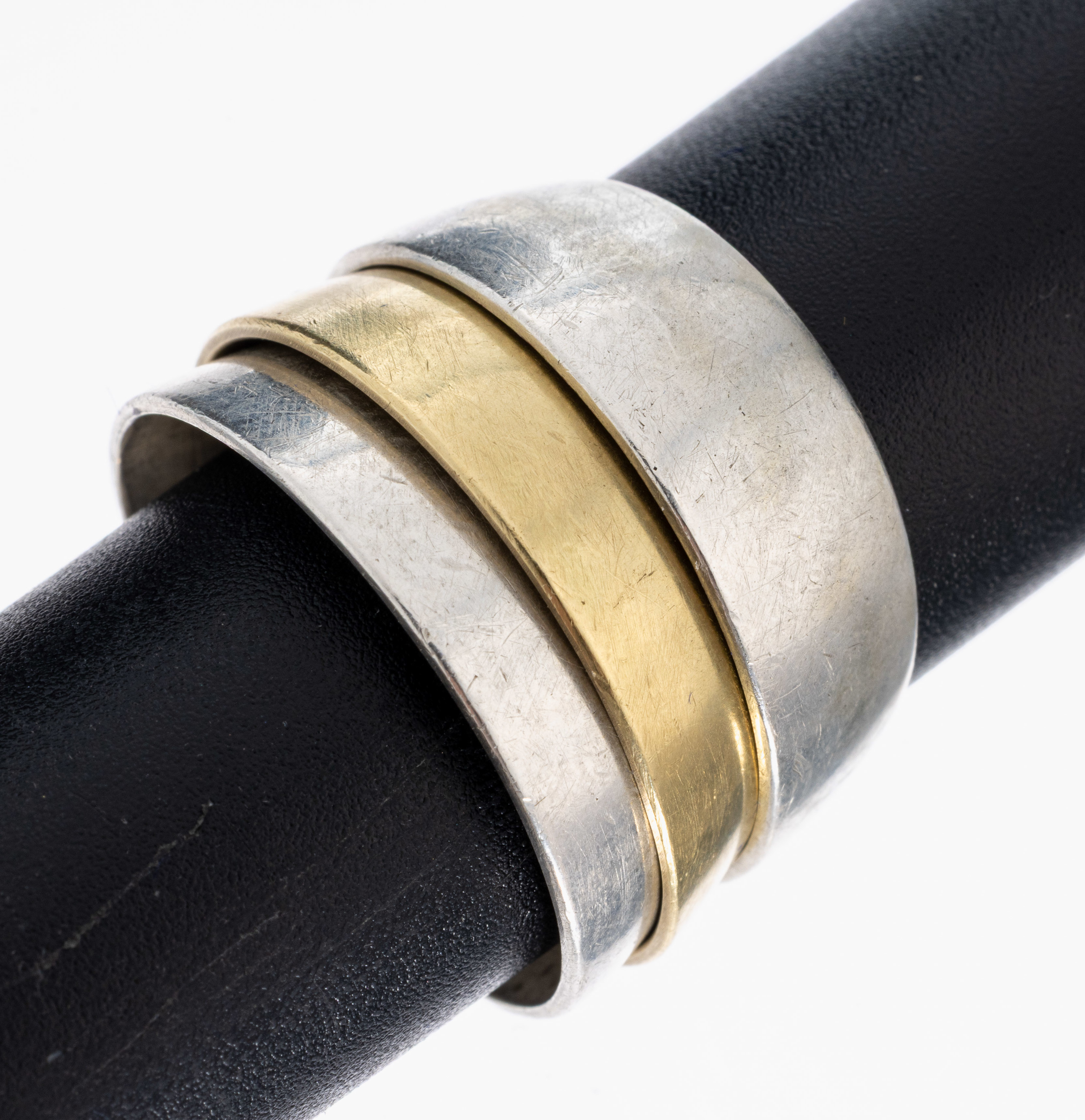 18 kt Gold und Silber Design Ringtrio, GG 750/000 und 925er Silber, sat., geschwungene