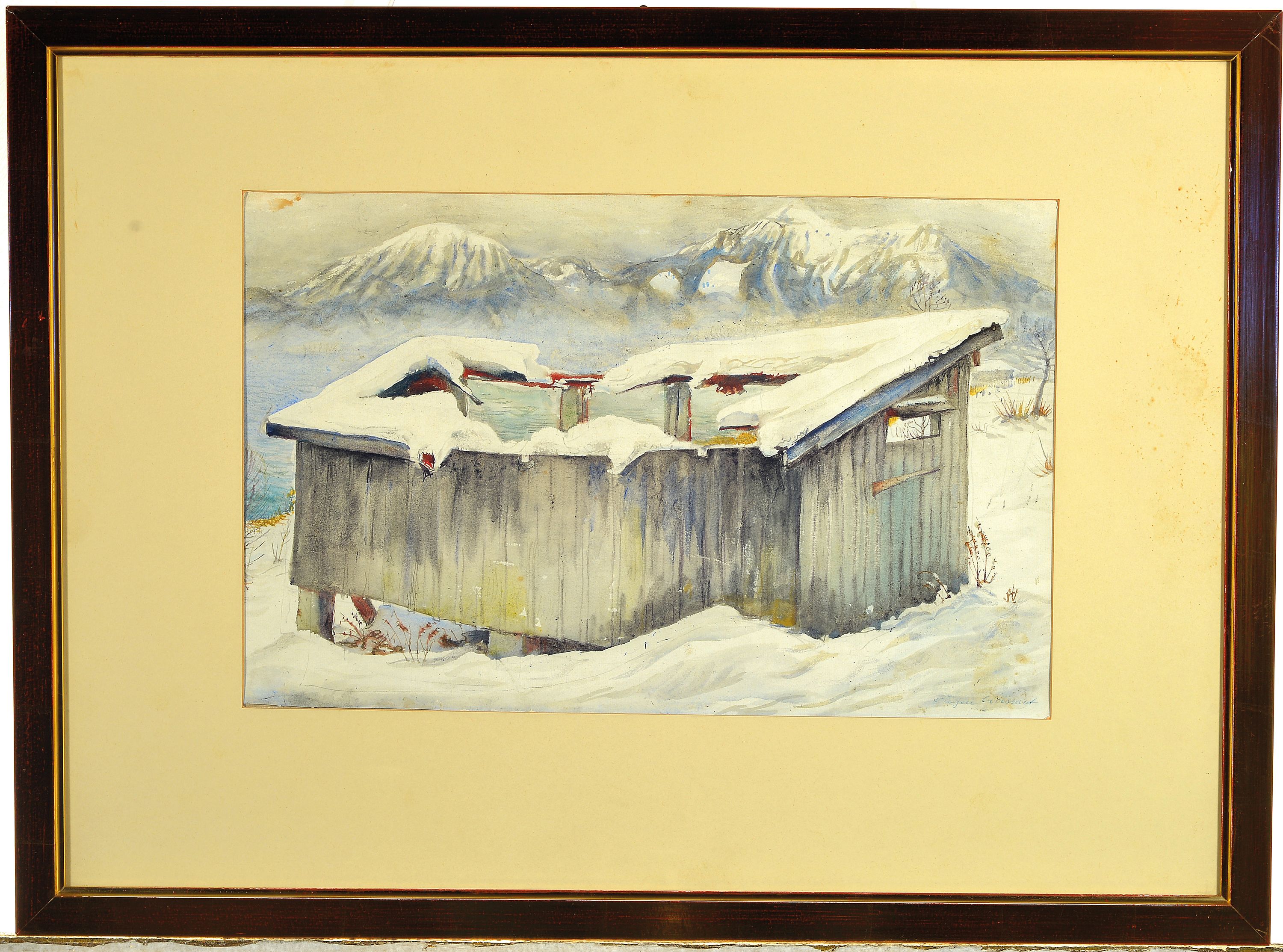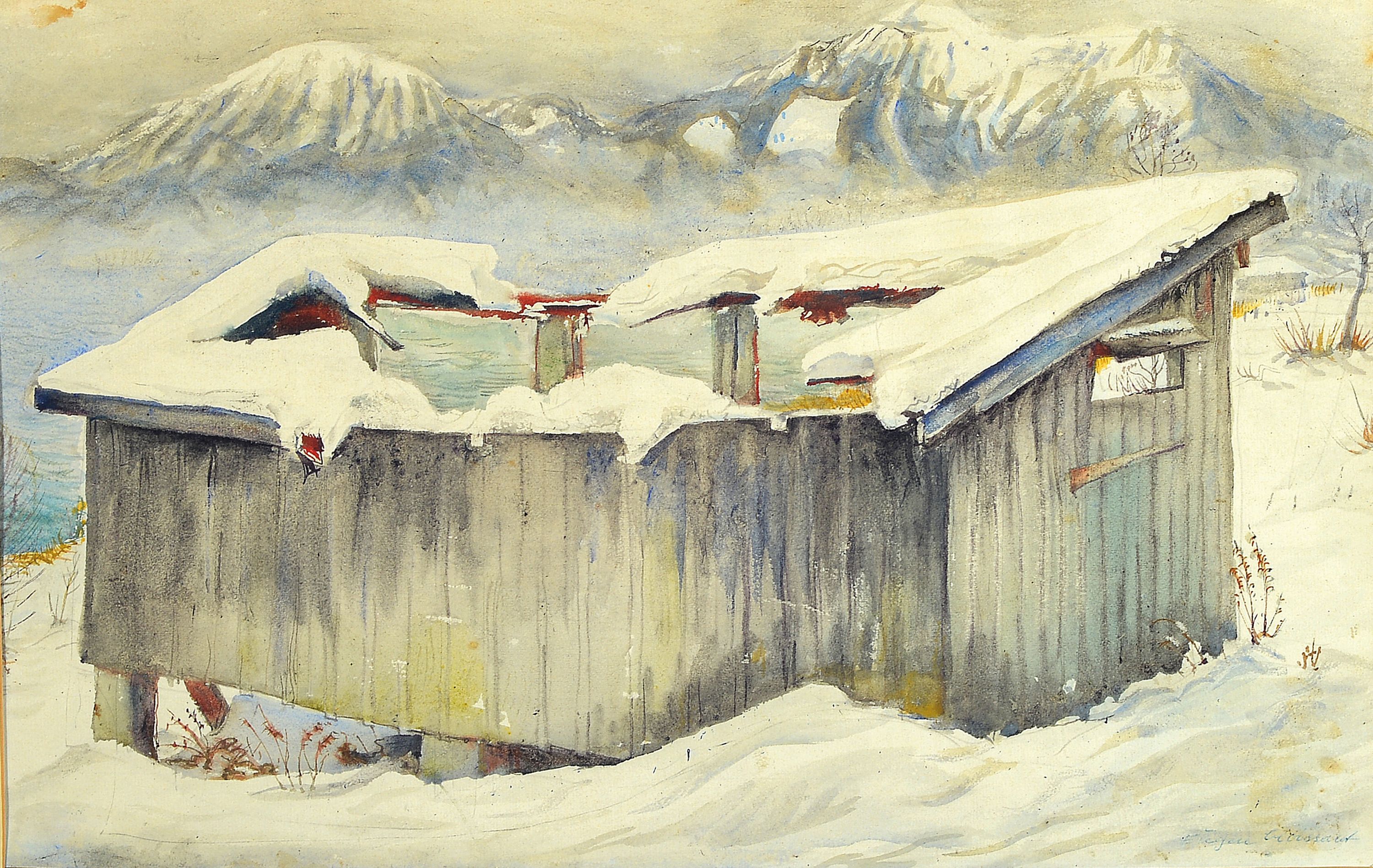 Eugen Croissant, 1898 Landau-1976 Breitbrunn, Winterlandschaft mit Hütte im Schnee,