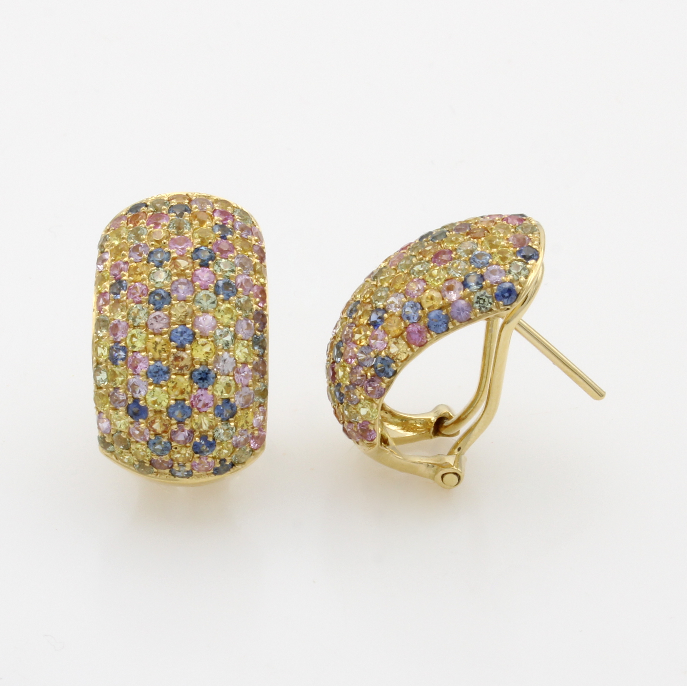 Paar Steckcreolen mit Saphiren, GG 750/000, fancy Saphire zus. ca. 4.24 ct, m. Clipbrisur Schätzpreis: 8800, - EUR