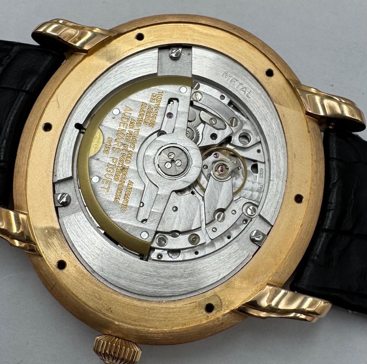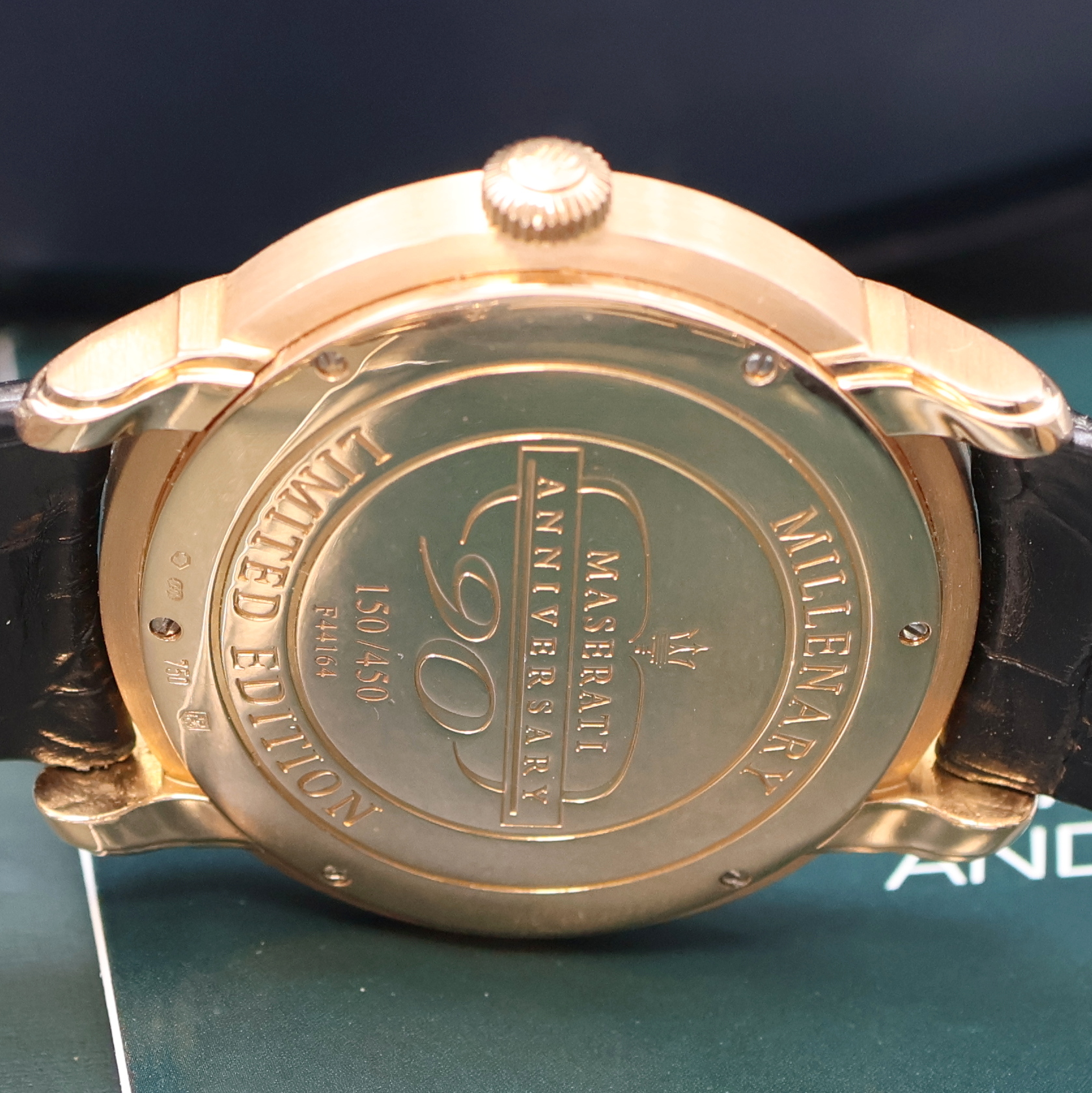 AUDEMARS PIGUET seltene, auf 450 Stück limitierte Armbanduhr Millenary Maserati in RG 750/000 Referenz 26150OR.OO.D003CU.01, Automatik, Schweiz um 2004, hergestellt zum 90. Jubiläum von Maserati, massives, 3-teil. Goldgehäuse inkl. orig. Lederband m. orig. RG 750/000 Faltschl., Boden mit Sondergravur "MASERATI ANNIVERSARY 90" 6-fach verschr., Anz. v. Std., Min., Datum, 2. Zeitzone, Gangreserve und Tag/Nacht, Werk rhod., 33 St., Kal. 2329, Rotor mit 21k Goldsegment, Streifenschl., D. ca. 47 mm, orig. Etui und Echtheitszertifikat, EZ 2, aus Sammlungsauflösung