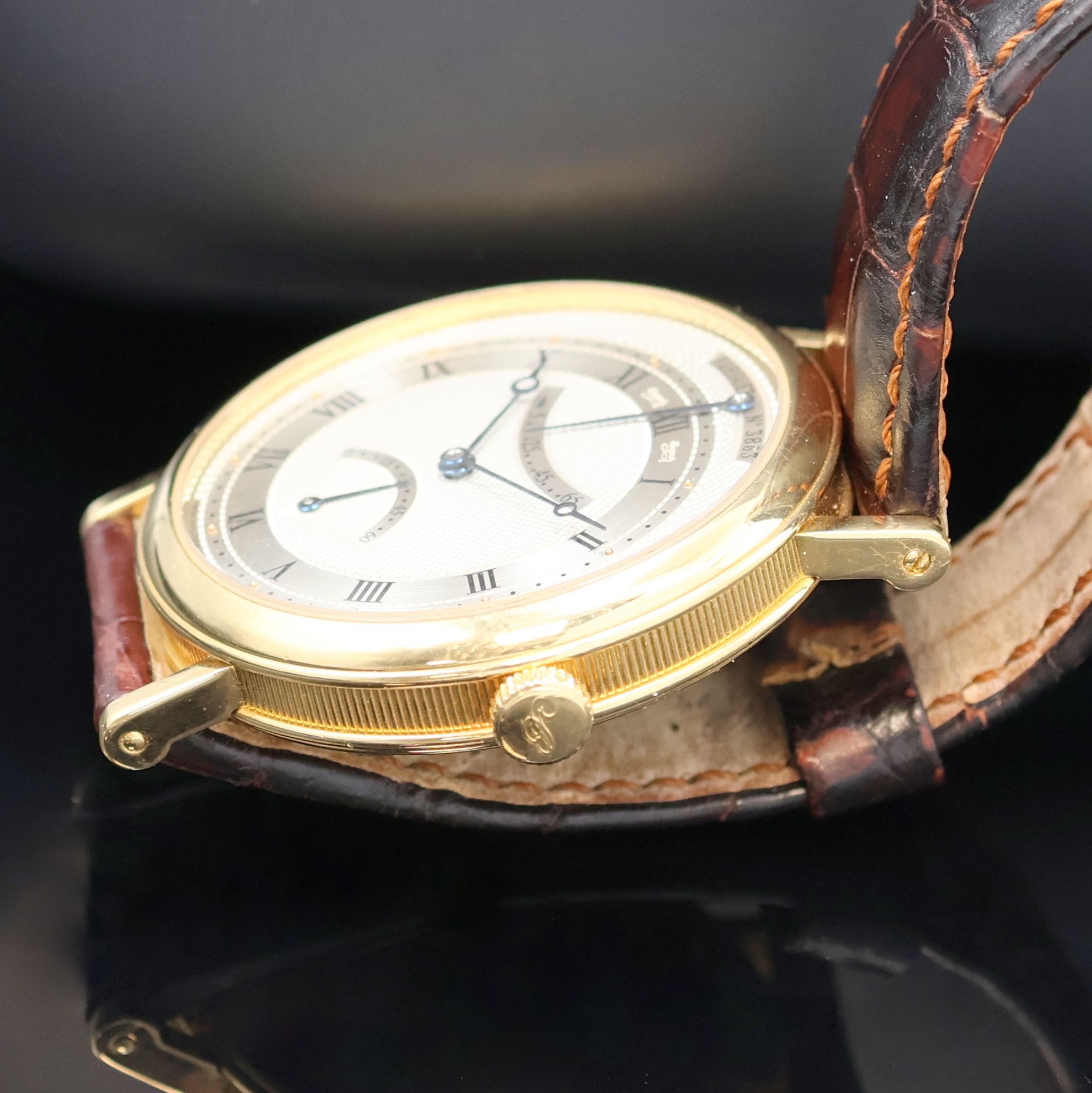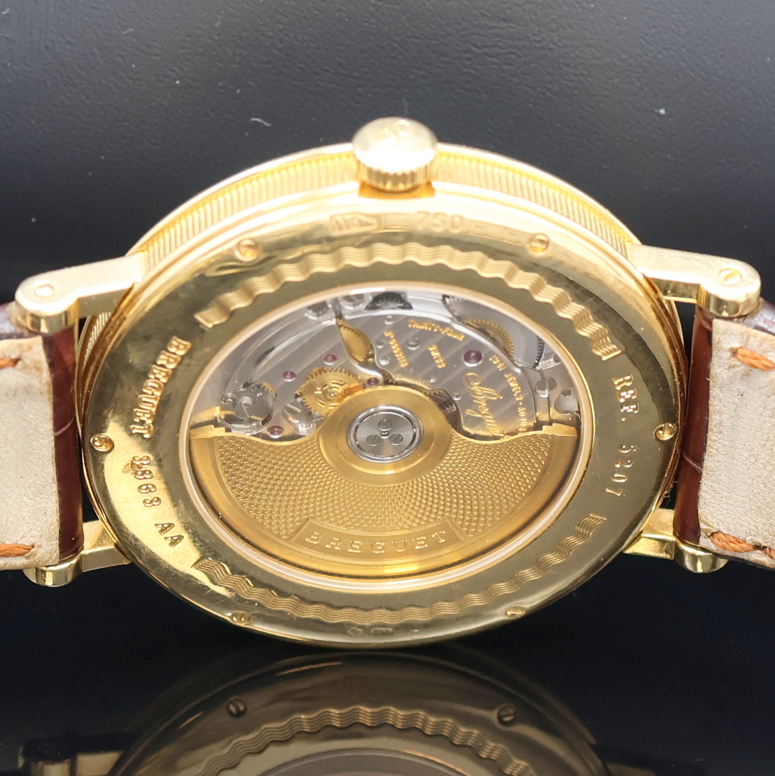 BREGUET Classique feine Armbanduhr in GG 750/000 Referenz 5207, Automatik, Schweiz um 2010, beids. vergl., 3-teil. Goldgeh. inkl. orig. Lederband m. orig. GG 750/000 Faltschl., zus. neues orig. Lederband anbei, Boden 6- fach verschr., silb., z. T. guill. Zifferbl. m. röm. Std., gebl. Breguetzeiger, Anz. v. Std., Min., retrograder Sek. und retrograder Gangreserve, Münzrand, Werk rhod., 34 St., Kal. 5160 DR SR, in 5 Lagen just., Streifenschl., D. ca. 40 mm, teilausgef. Pap. und Servicebox anbei, Überh. empf., EZ 2, aus Sammlungsauflösung