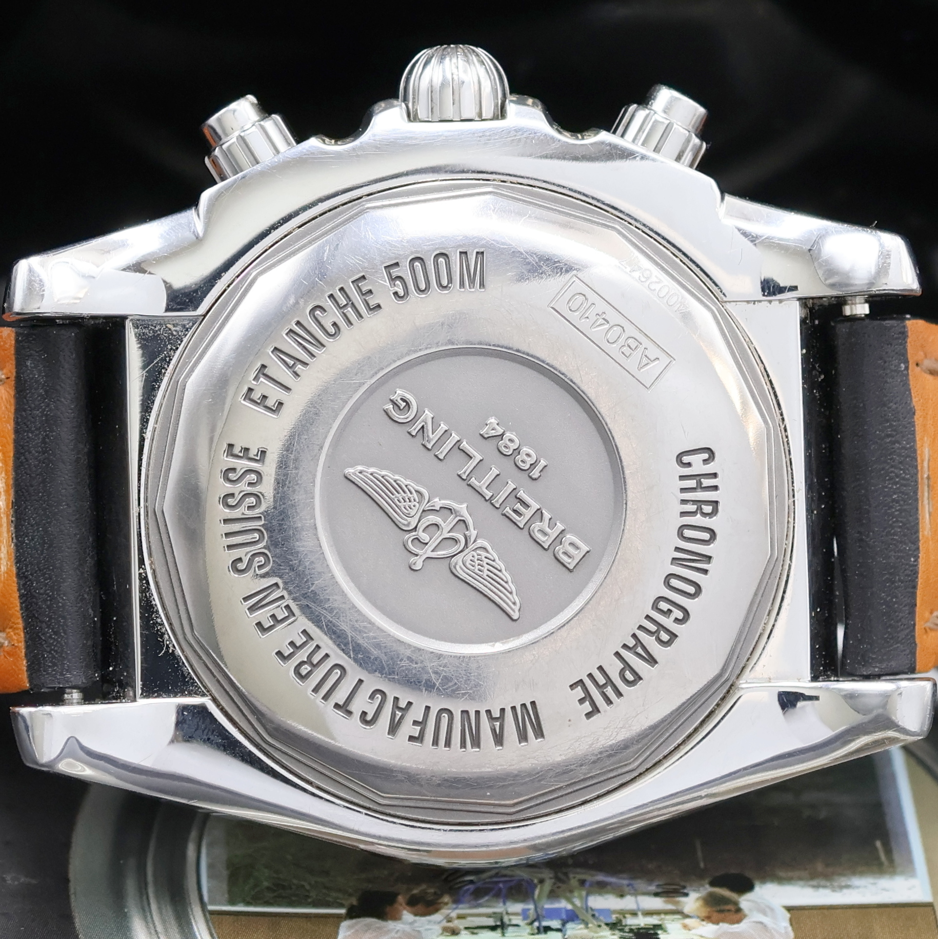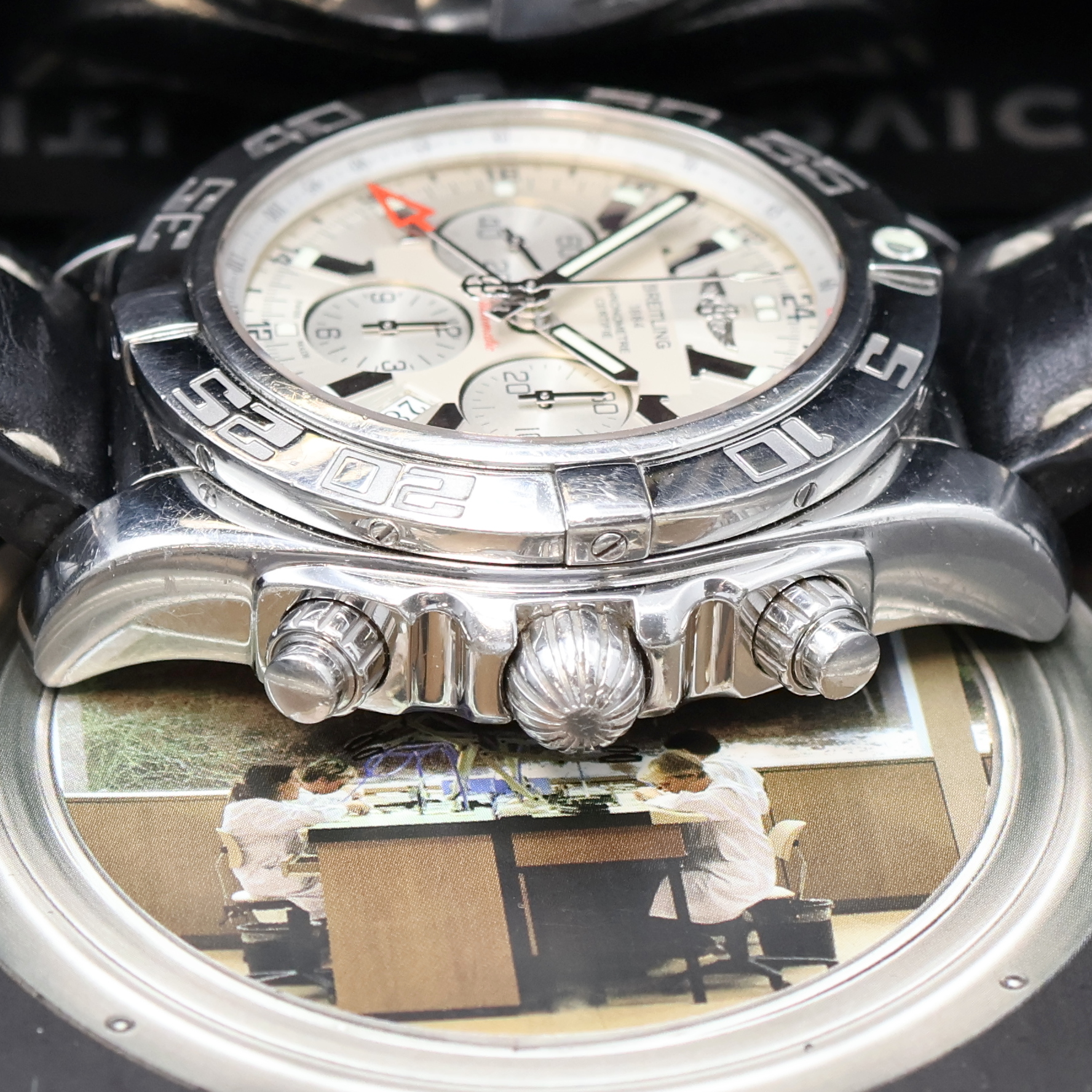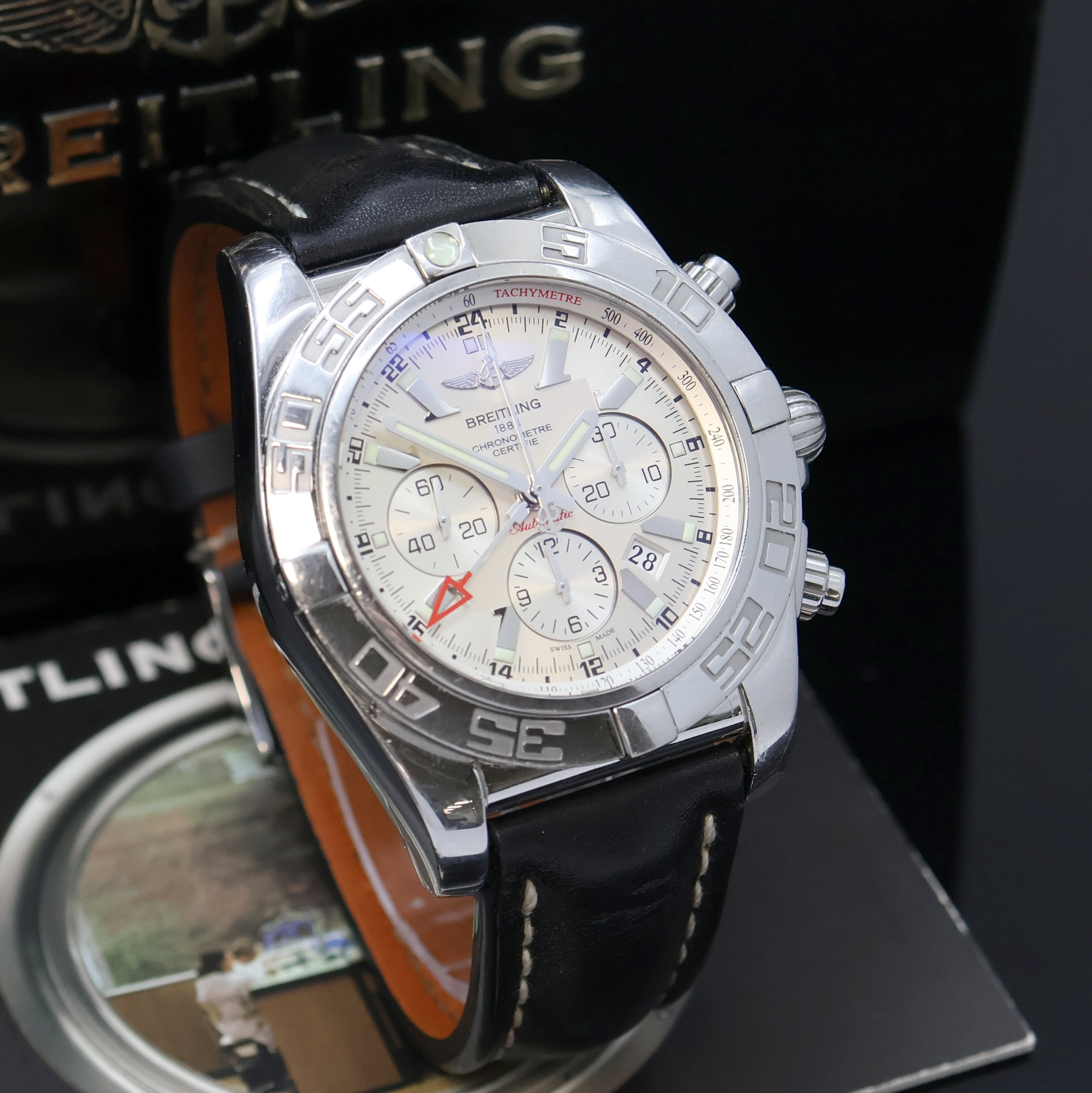 BREITLING Chronomat GMT Armbandchronograph Referenz AB041012, Automatik, Schweiz um 2014, Chronometer in Edelstahl inkl. orig. Lederband m. orig. Dornschl., Boden, Krone und Drücker verschr., ab Herst. wasserd., Lünette m. 60er Teilung eins. rast. drehb., silb. Zifferbl. m. aufgel. Indizes, Anz. v. Std., Min., kl. Sek., Datum, 2. Zeitzone und Chronographenz., Werk rhod., 47 St., Kal. B04, D. ca. 47 mm, Breitling Etui und Duplikat der Kaufrechnung anbei, EZ 2, aus Sammlungsauflösung