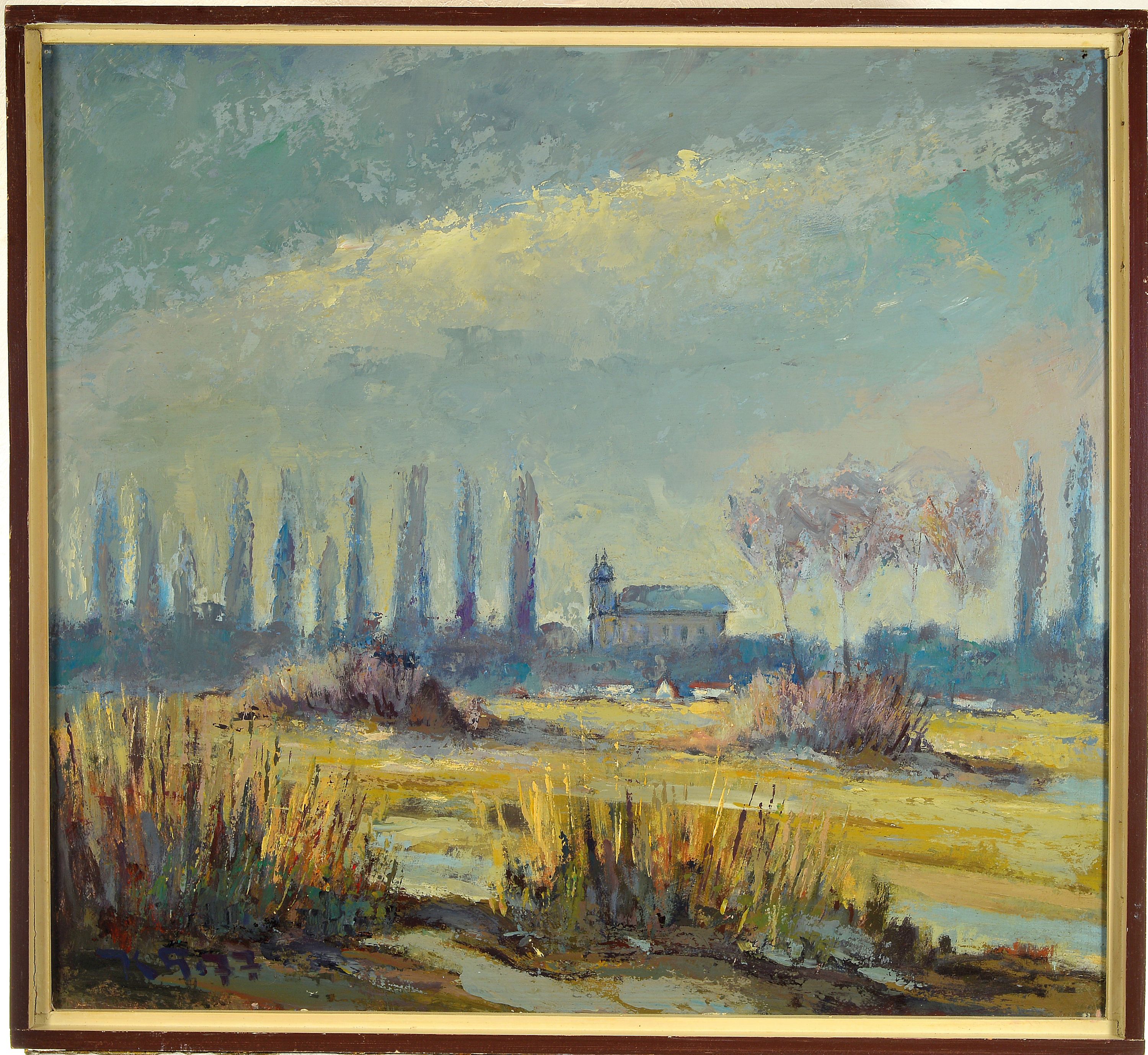 Karl Graf, 1902-1986 Speyer, Landschaft mit Kapelle und Pappeln, Öl/Hartfaser, links