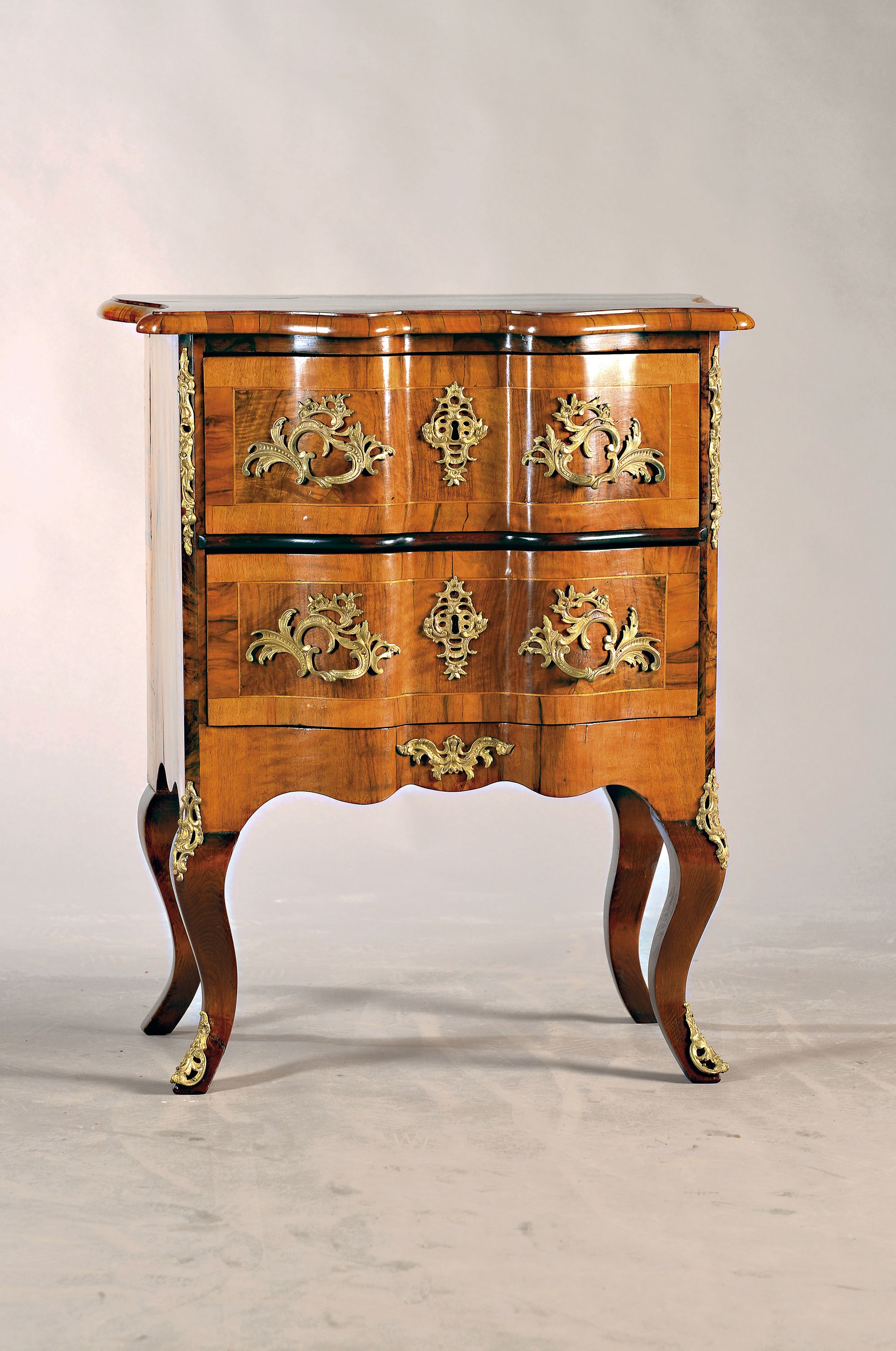 Kleine Dresdner Kommode, um 1890/1900, Barockstil, Nussbaumfurnier, z.T. Fadenintarsien,