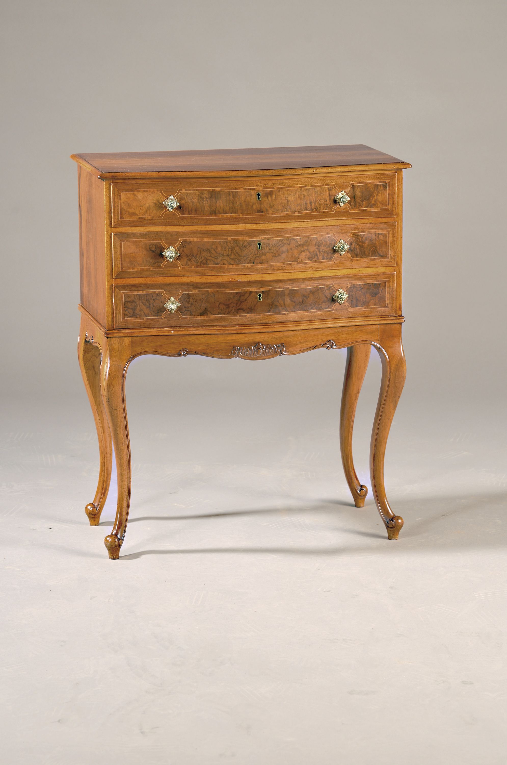 Kleine Barockstilkommode, deutsch um, 1900, Nussbaumfurnier, Schubladen innen z.T.