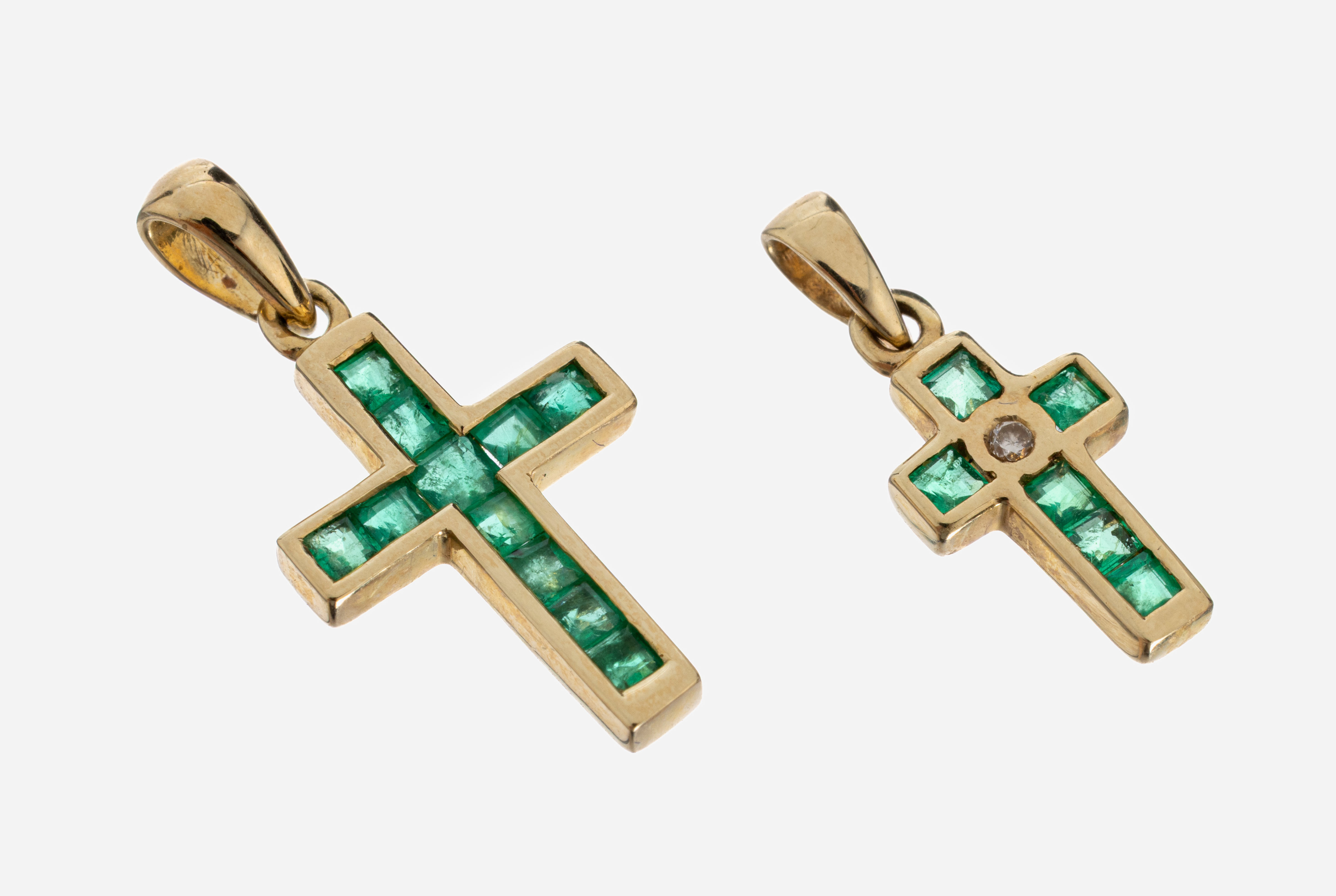 Konvolut 2 14 kt Gold Smaragd-Kreuzanhänger, GG 585/000, 1 x ca. 2 x 1 cm, 11 facett.