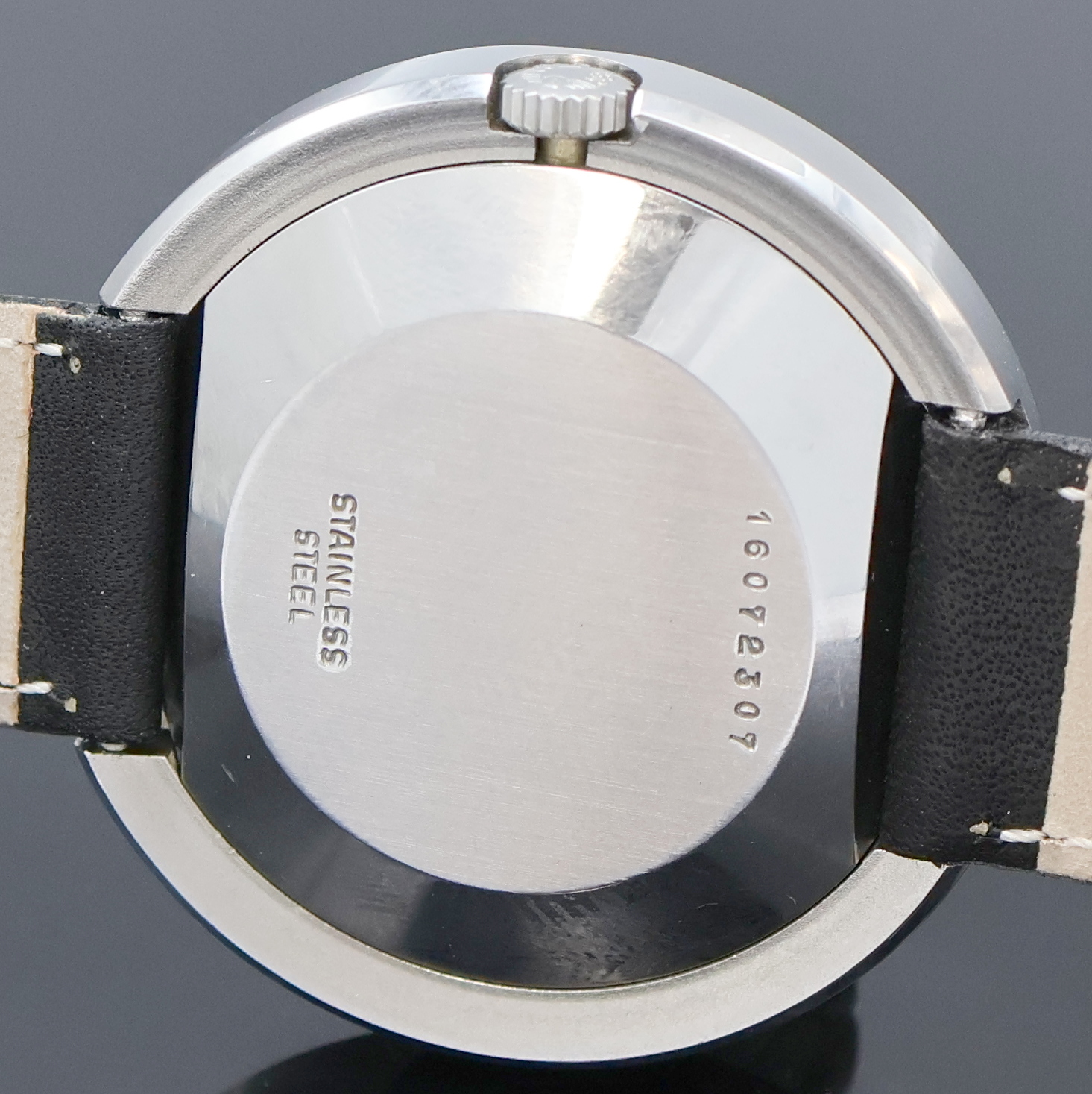 Schweiz um 1970, zylindr. Monocoque-Geh., breite aufges. Lünette m. verdeckten Anstößen,