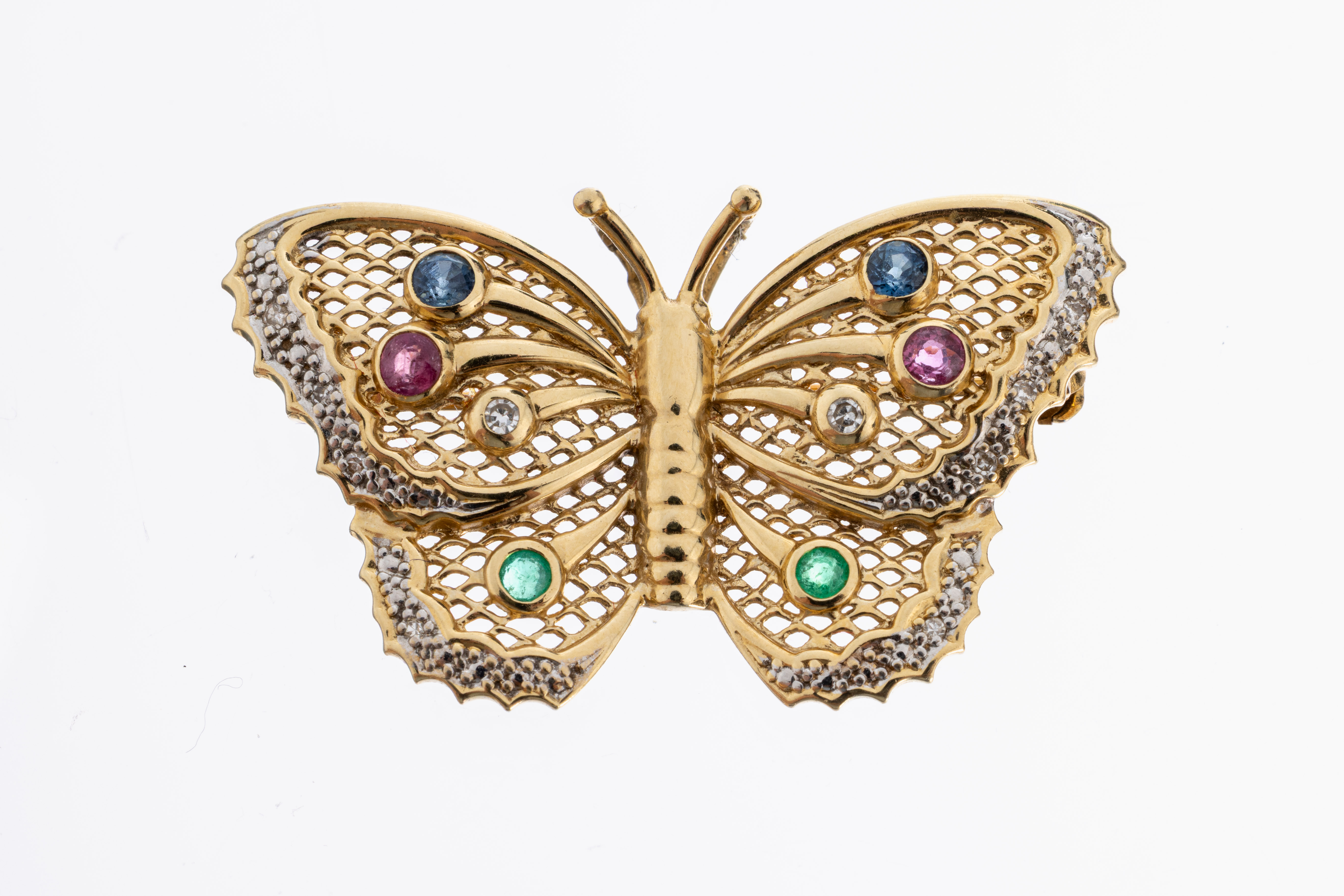14 kt Gold Farbstein-Diamant-Brosche, GG 585/000, Darstellung eines Schmetterlings,