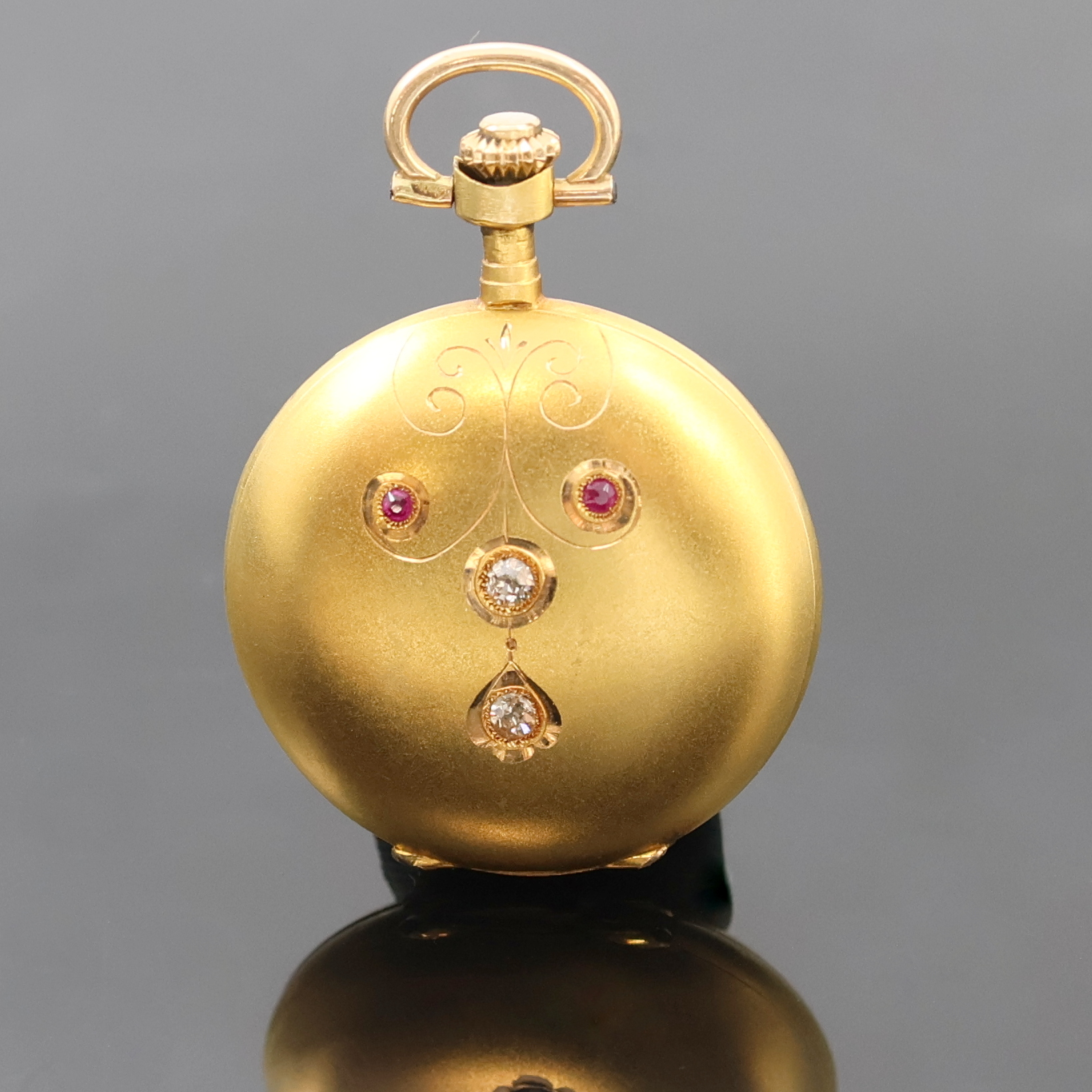Damensavonette in GG 585/000 mit Diamanten und Rubinen, Schweiz um 1890, 3-Deckel