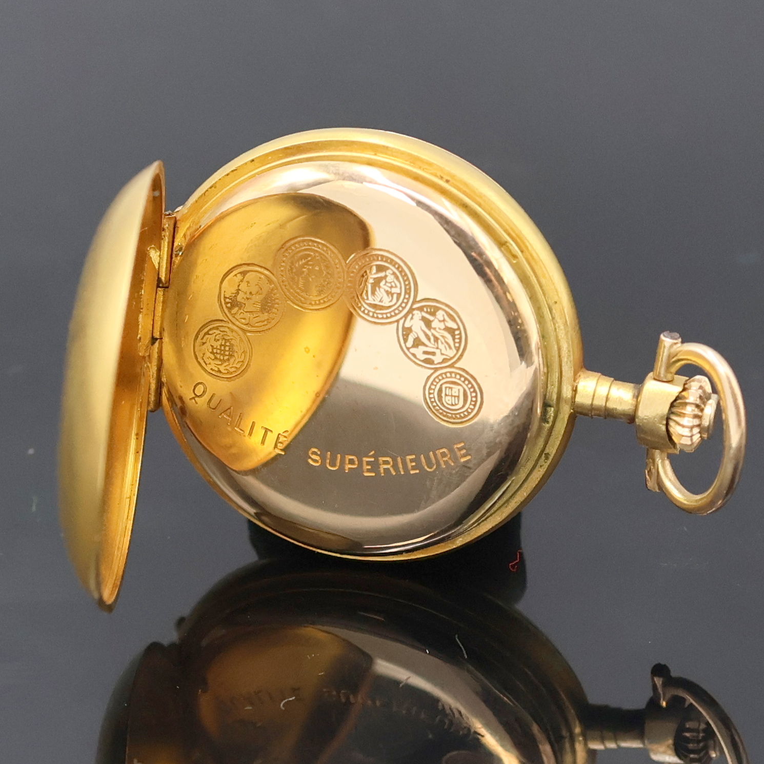 Medaillengrav., Emailzifferbl. m. arab. Zahlen und gold. Minuterie, gold. Zeiger,
