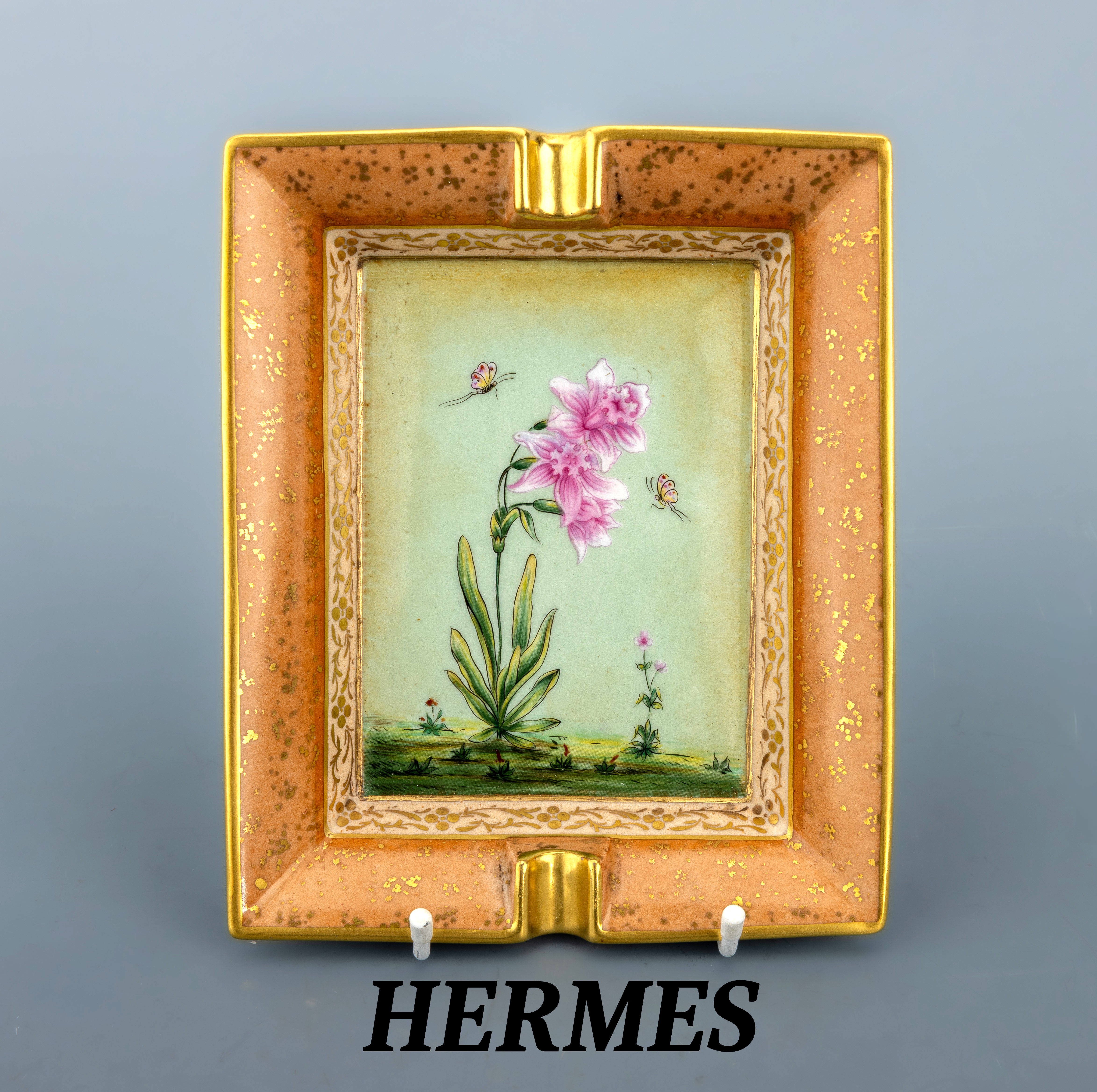 HERMES Aschenbecher, weißes Porzellan, Darstellung einer rosafarb. Orchidee mit