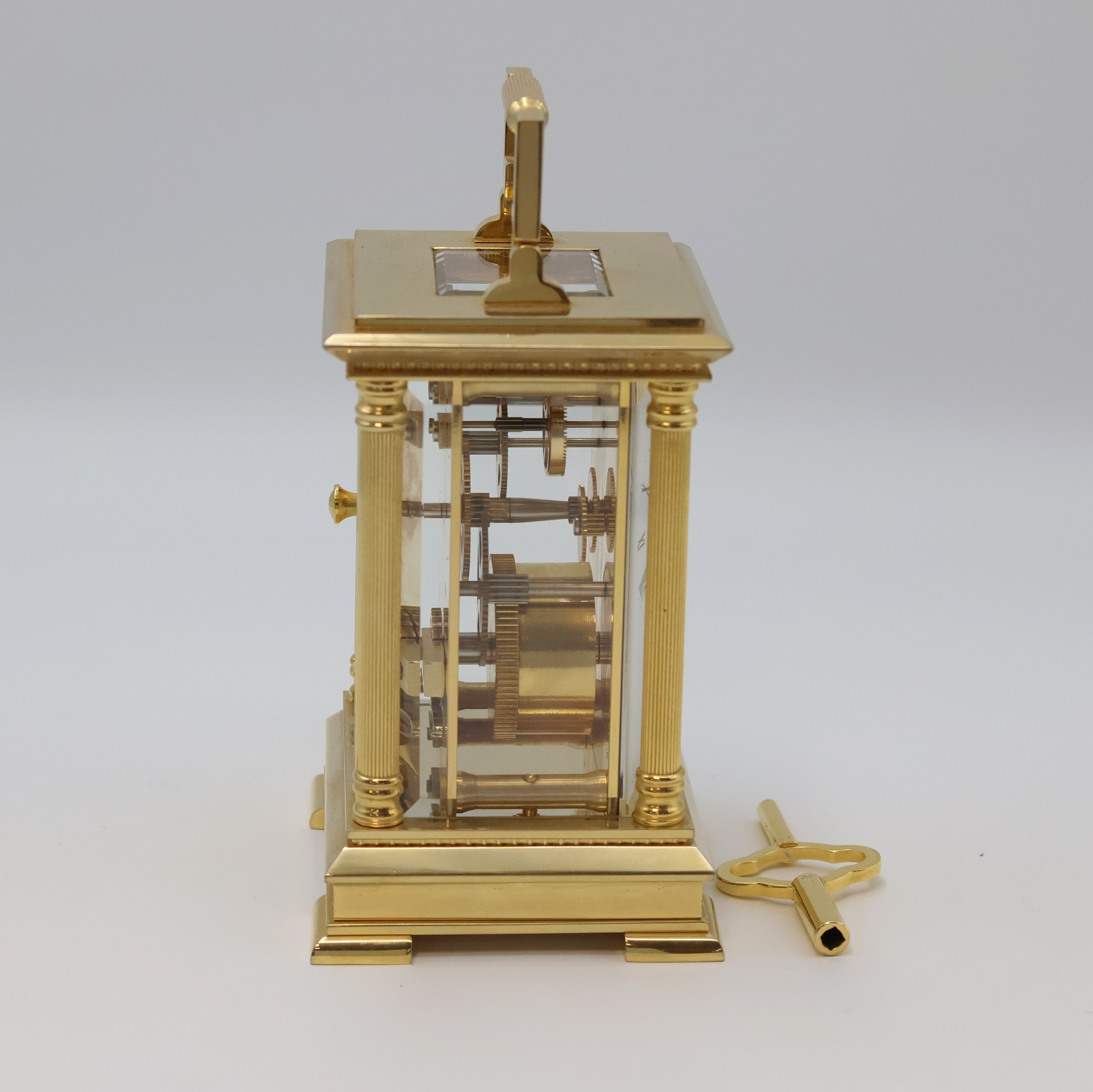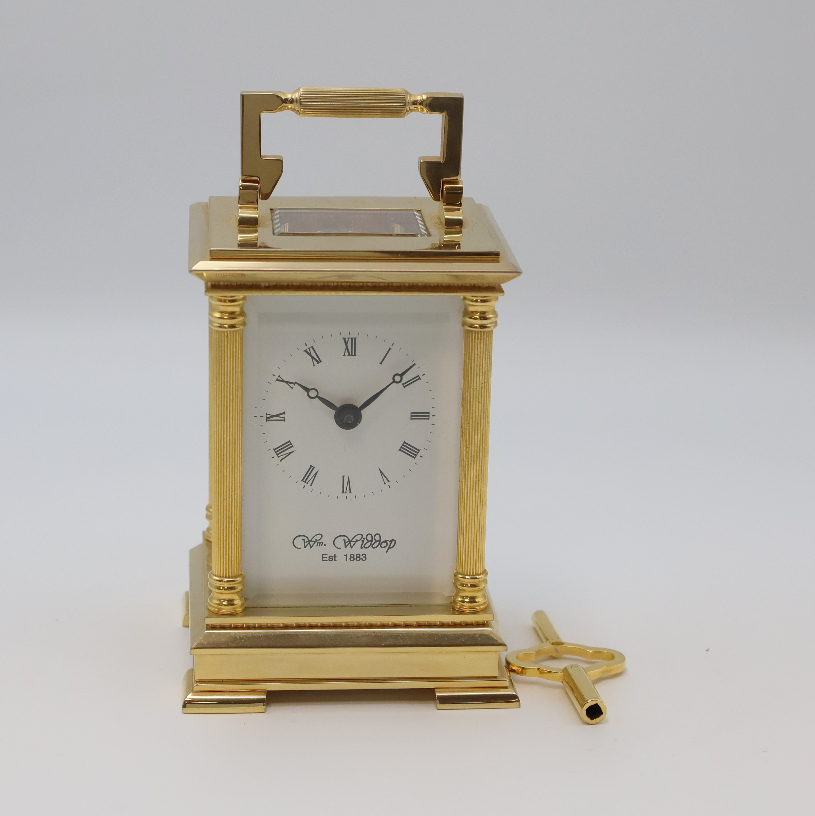 WM. WIDDOP vergoldete 8 Tage Reiseuhr, um 1980, Schlüsselaufzug, verg. Geh. 5-fach