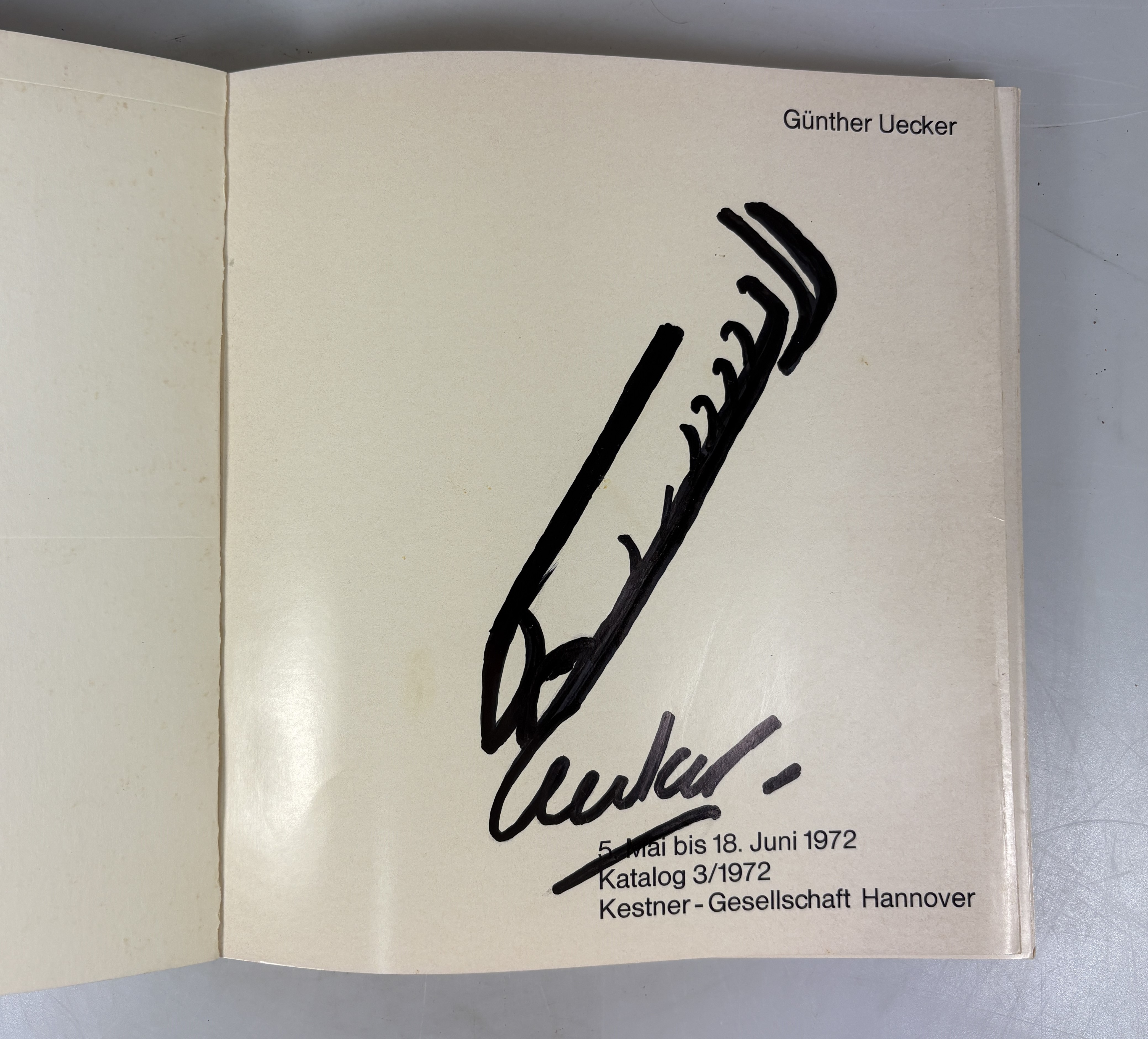 Günther Uecker, geb. 1930, Ausstellungs- Katalog mit signierter Nagelzeichnung, Titel: Kestner-Gesellschaft Hannover 5.Mai bis 18.Juni 1972 Katalog 3/1972, ca. 20x20 cm