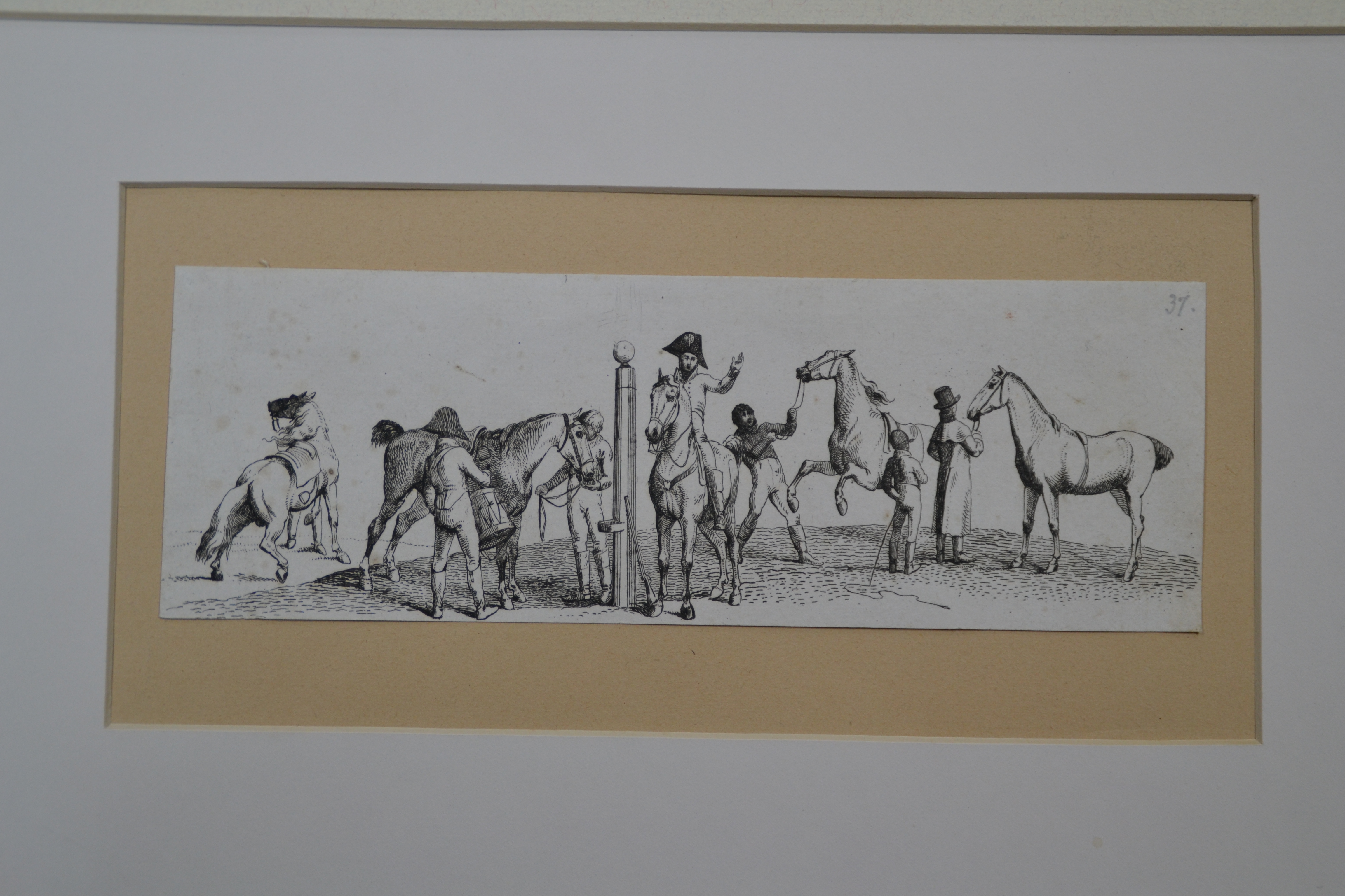 Pferdeszene samt napoleonischen Offizieren und Knechten, datiert 1807, versch. Größen,