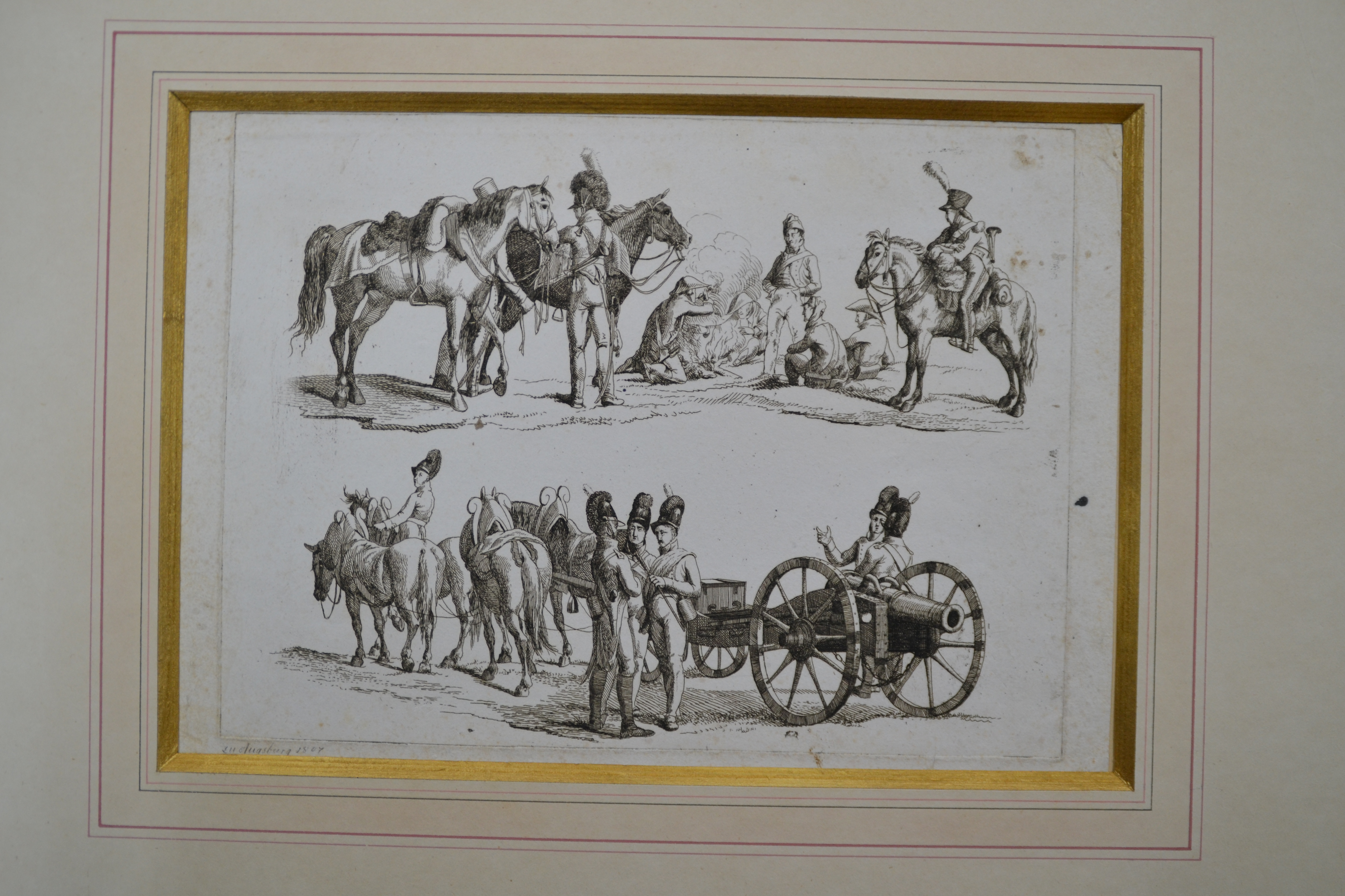 und dat. Augsburg 1807; 2 Soldatenszenen mit Pferden und Kanonenwagen, dat. 1807,