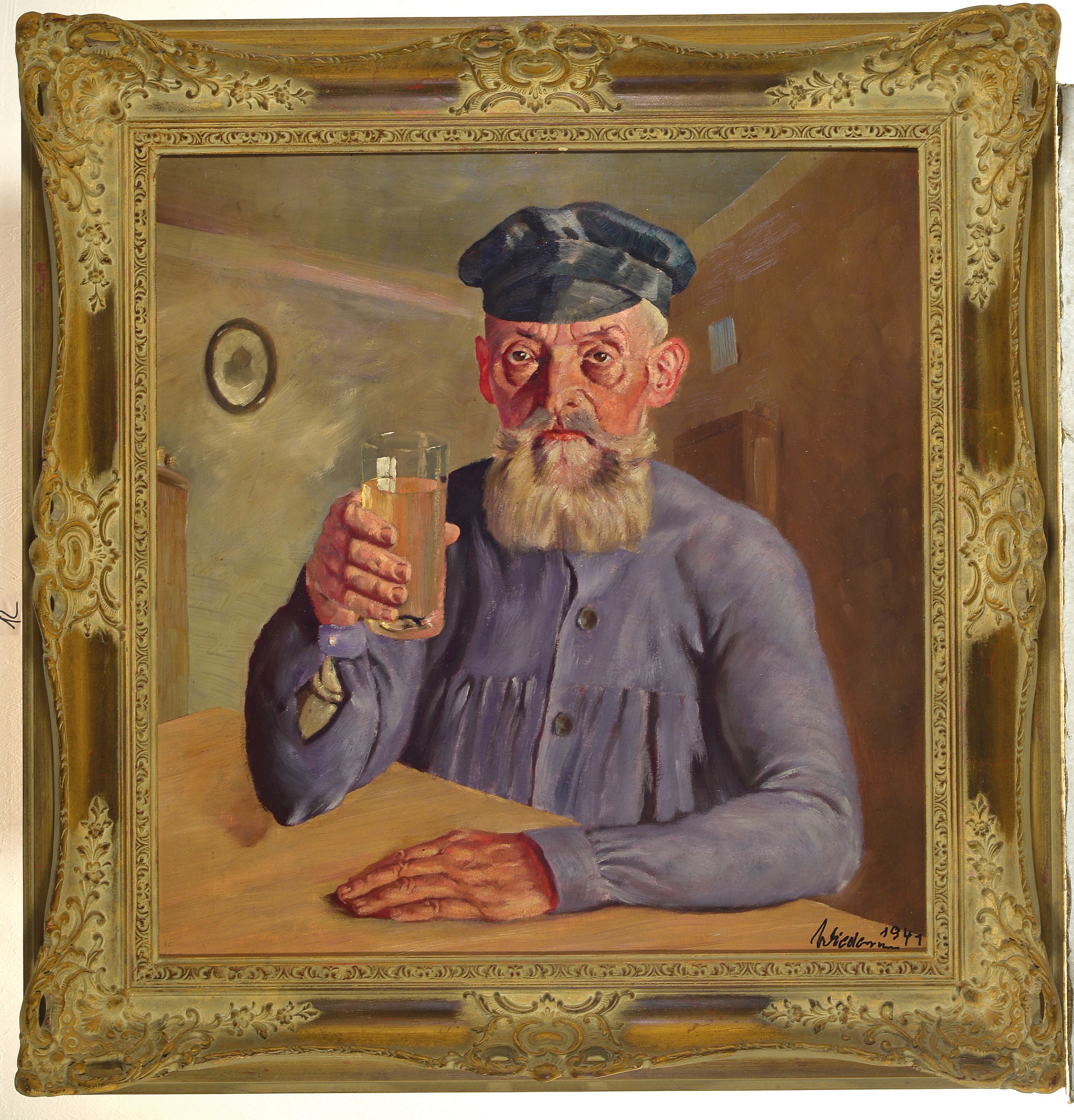 Fritz Wiedemann, 1920 Gimmeldingen-1987 Mußbach, Pfälzer Winzer mit Schoppenglas,
