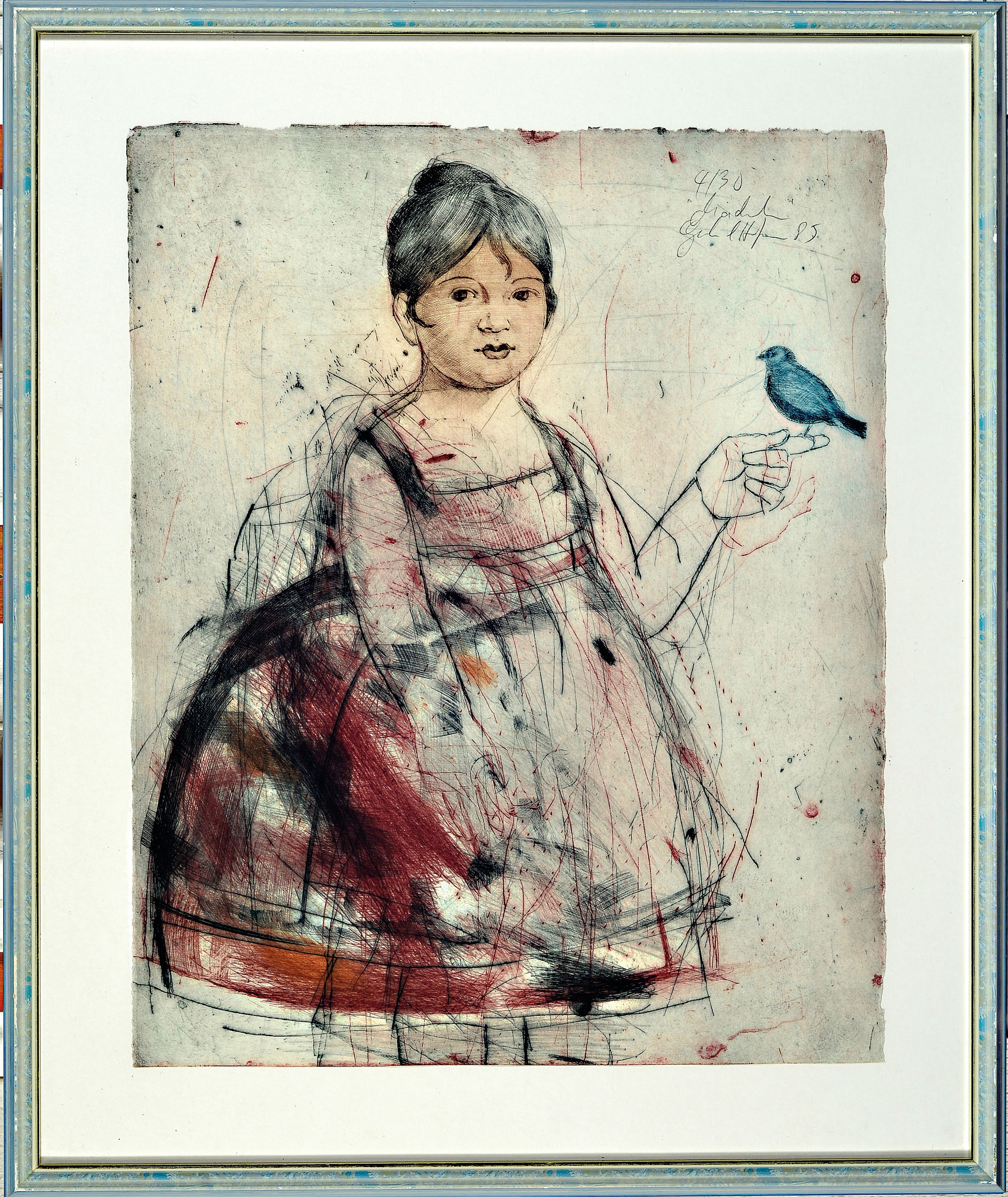Mädchen mit Vogel, Farbaquatintaradierung, sign. und dat. 85, betitelt und num.