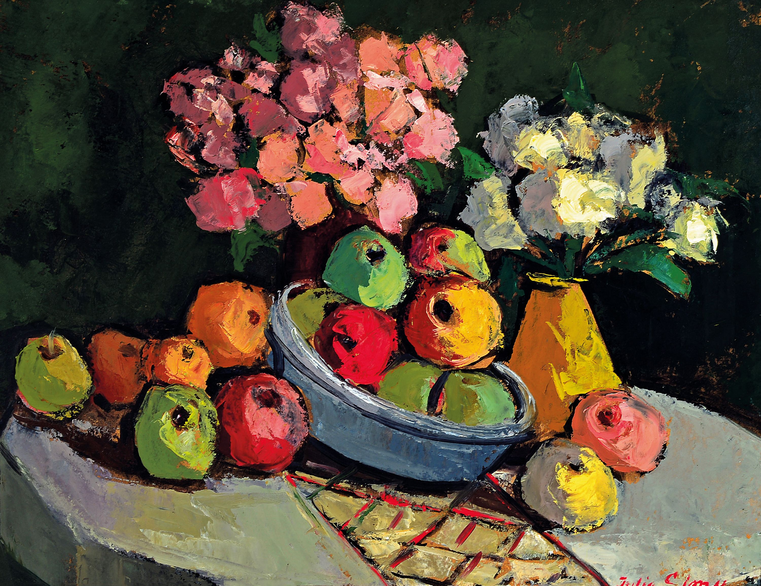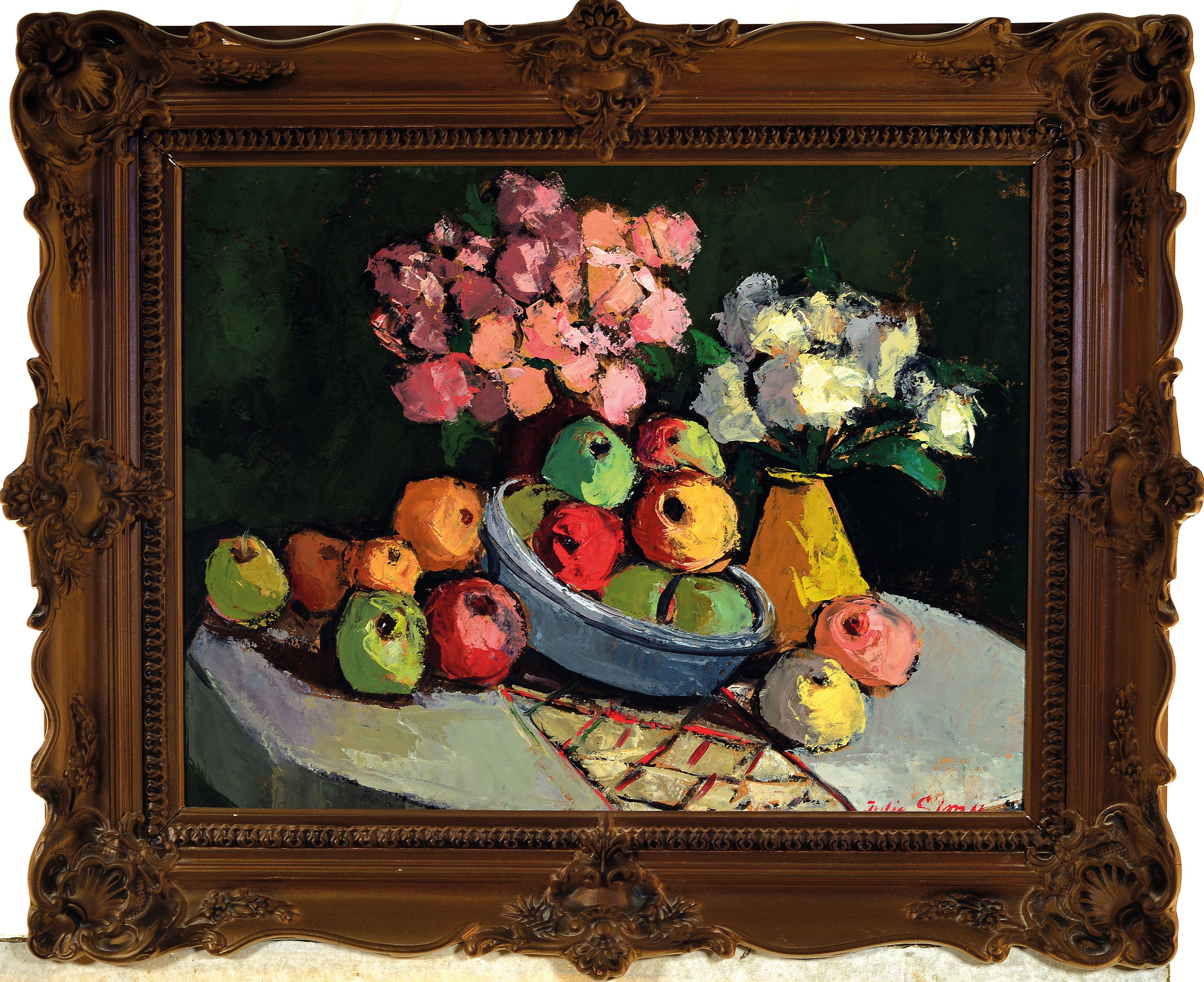 Äpfeln und Blumen, Öl/Malkarton, rechts unten sign., ca. 42x55cm, R. ca. 61x74cm