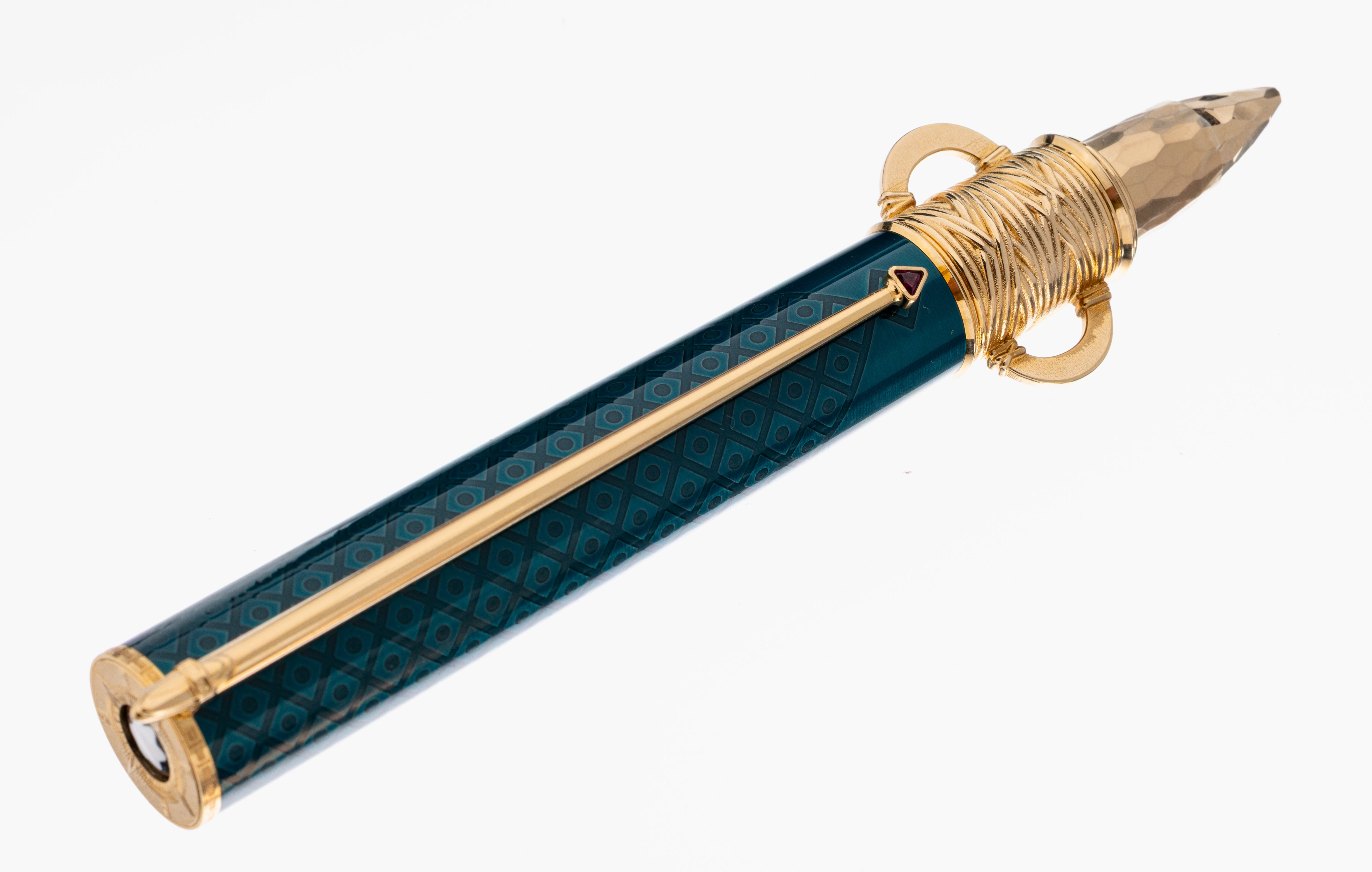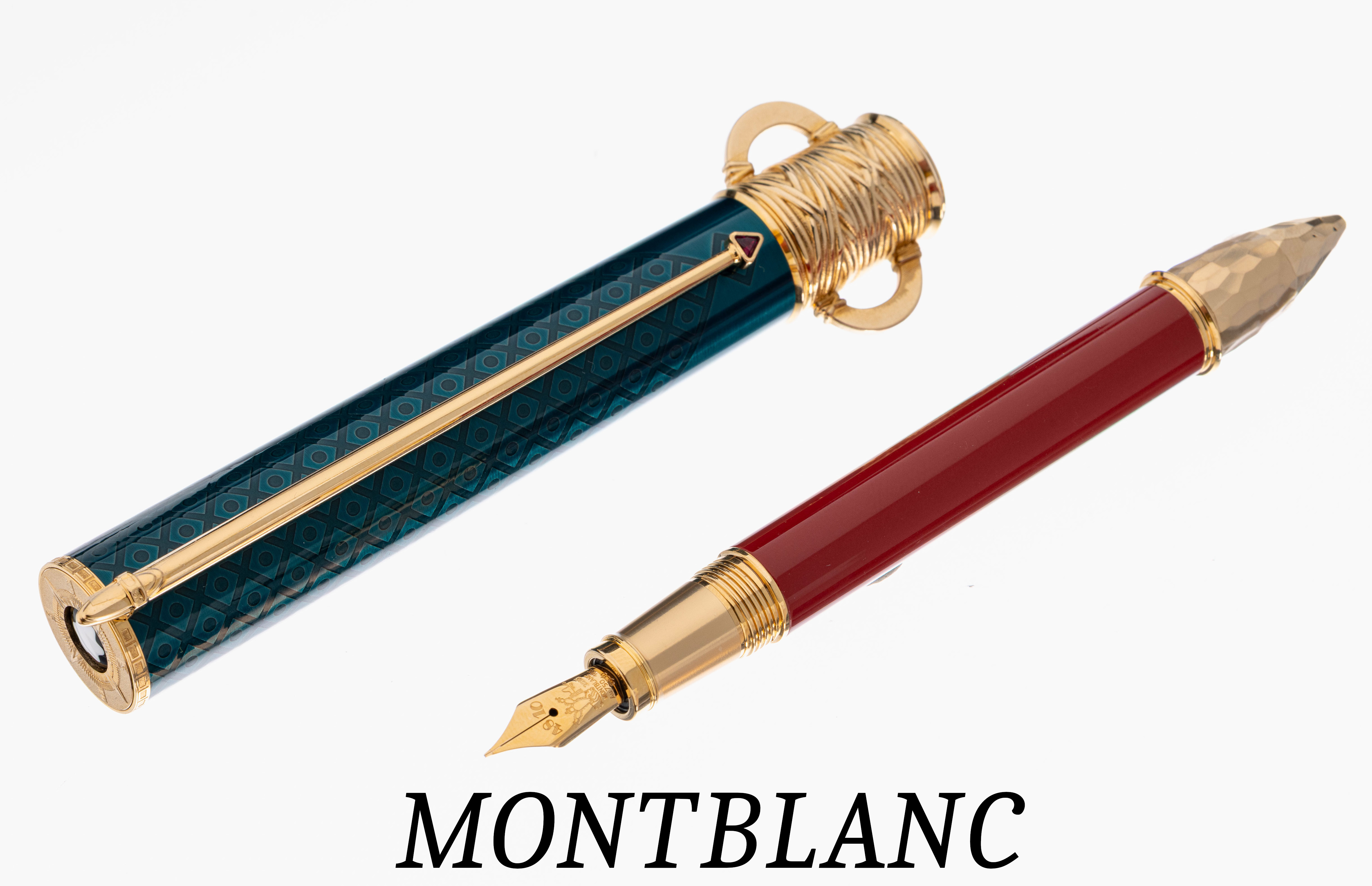MONTBLANC Kolbenfüllhalter, Patron of Art, Limited Edition 4810, Homage to Moctezuma I, Erscheinungsjahr 2020, 18 kt GG Feder mit ausgefallener Gravur, Korpus rot lackiert, ausgefallene lange Kappe türkis lackiert, mit 3D-Effekt, Kappenkopf mit Sonnenscheibe, mit MB Emblem, Monturen und Clip Metall verg., limitiert: hier 3990/4810, mit Papieren, Holzetui und Umkarton, sehr guter Erhaltungs- zustand