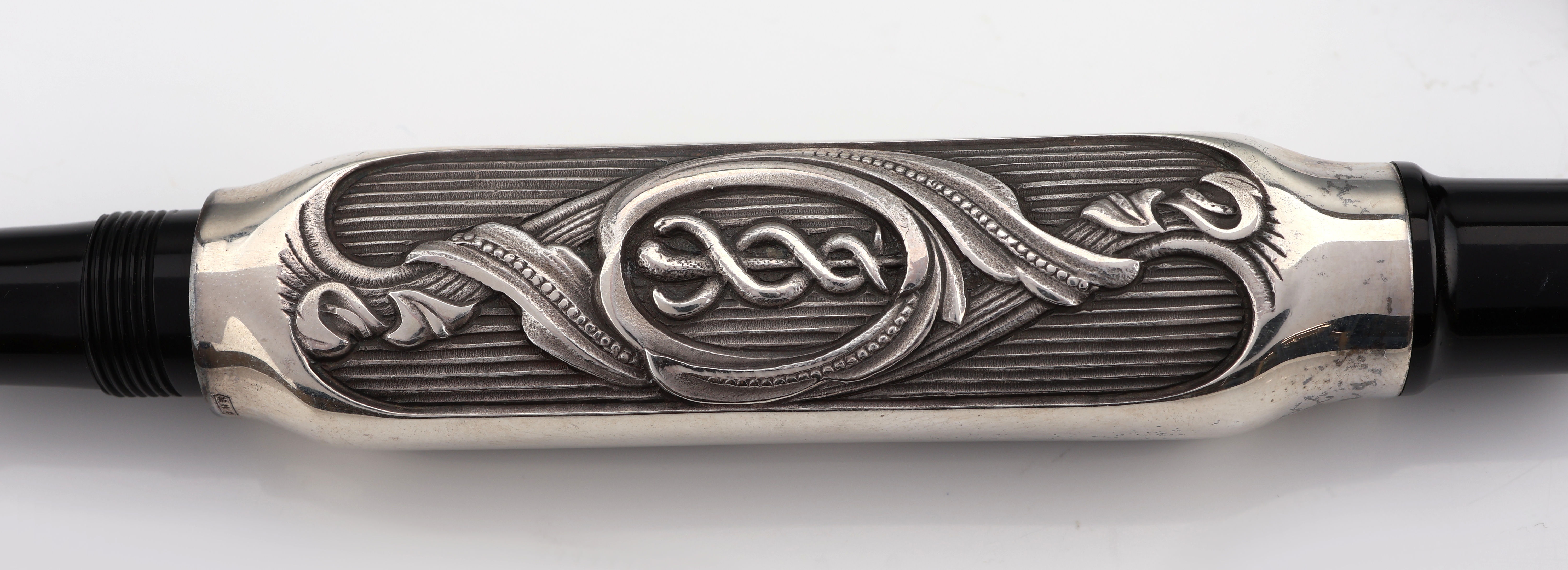Korpus aus 925er Silber mit Aeskulap Symbol, gegenüberliegende Seite mit Jugendstil-
