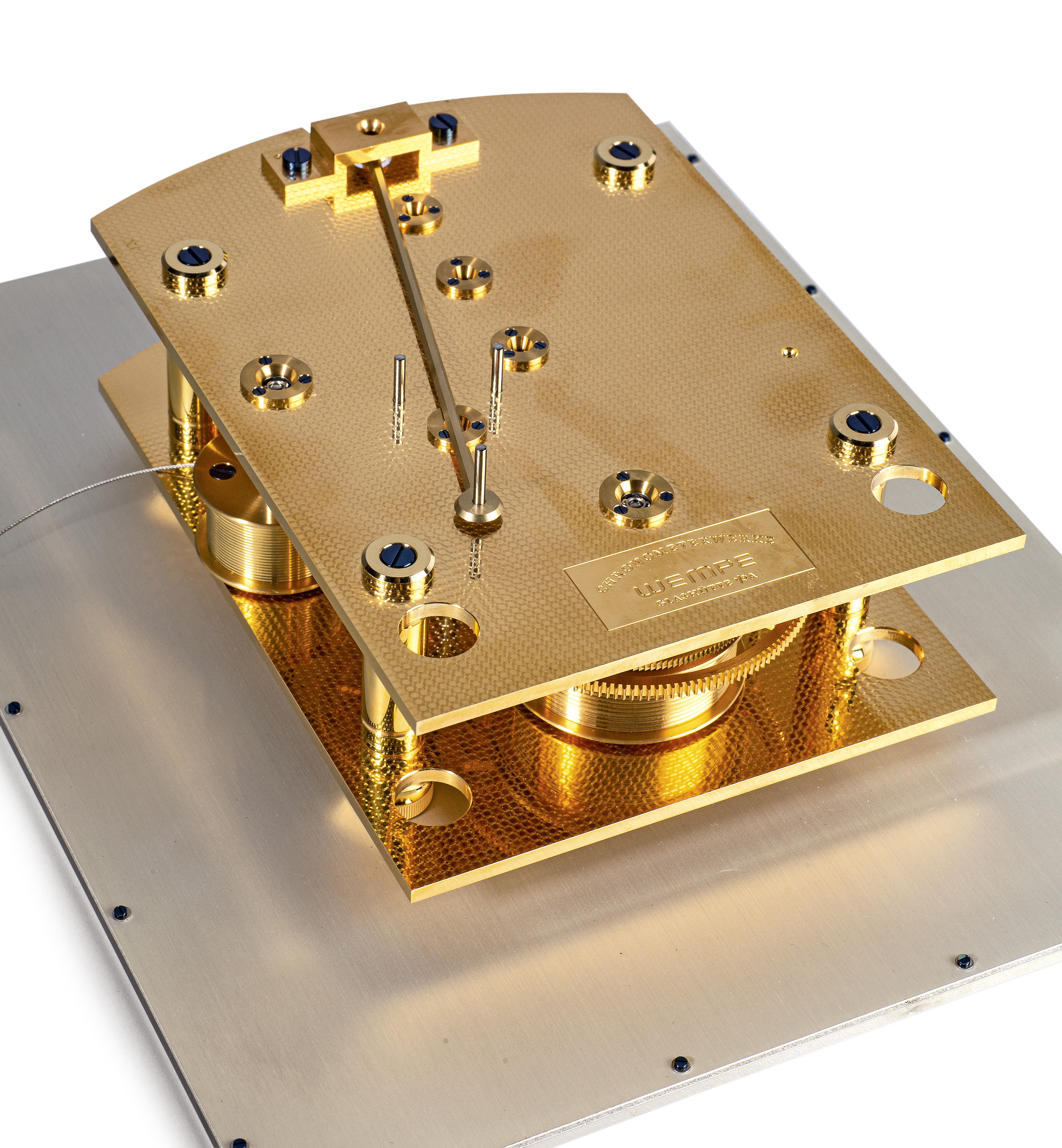 bei 12, zentrale Minute, vergoldetes Messingwerk (Oberfläche mit Chronometer- Spotting)