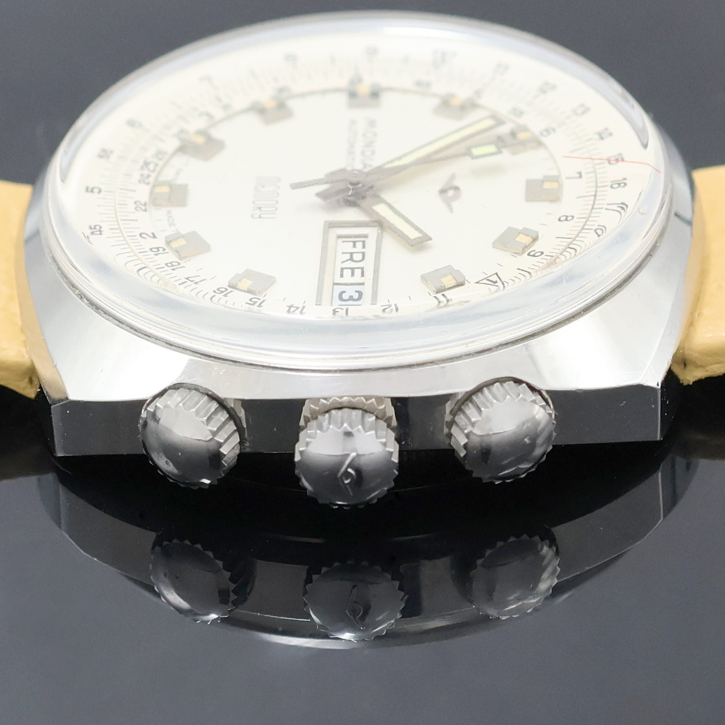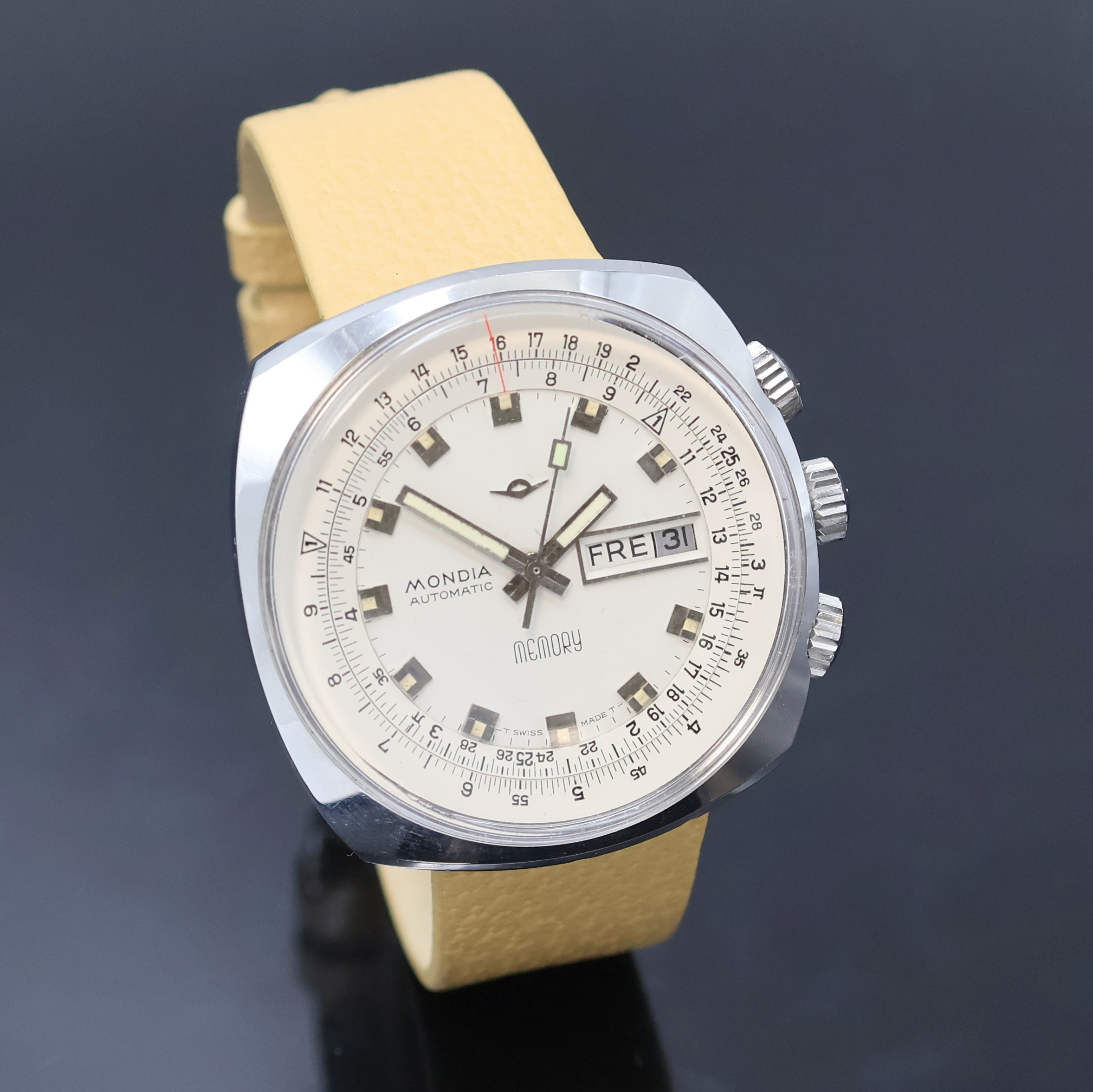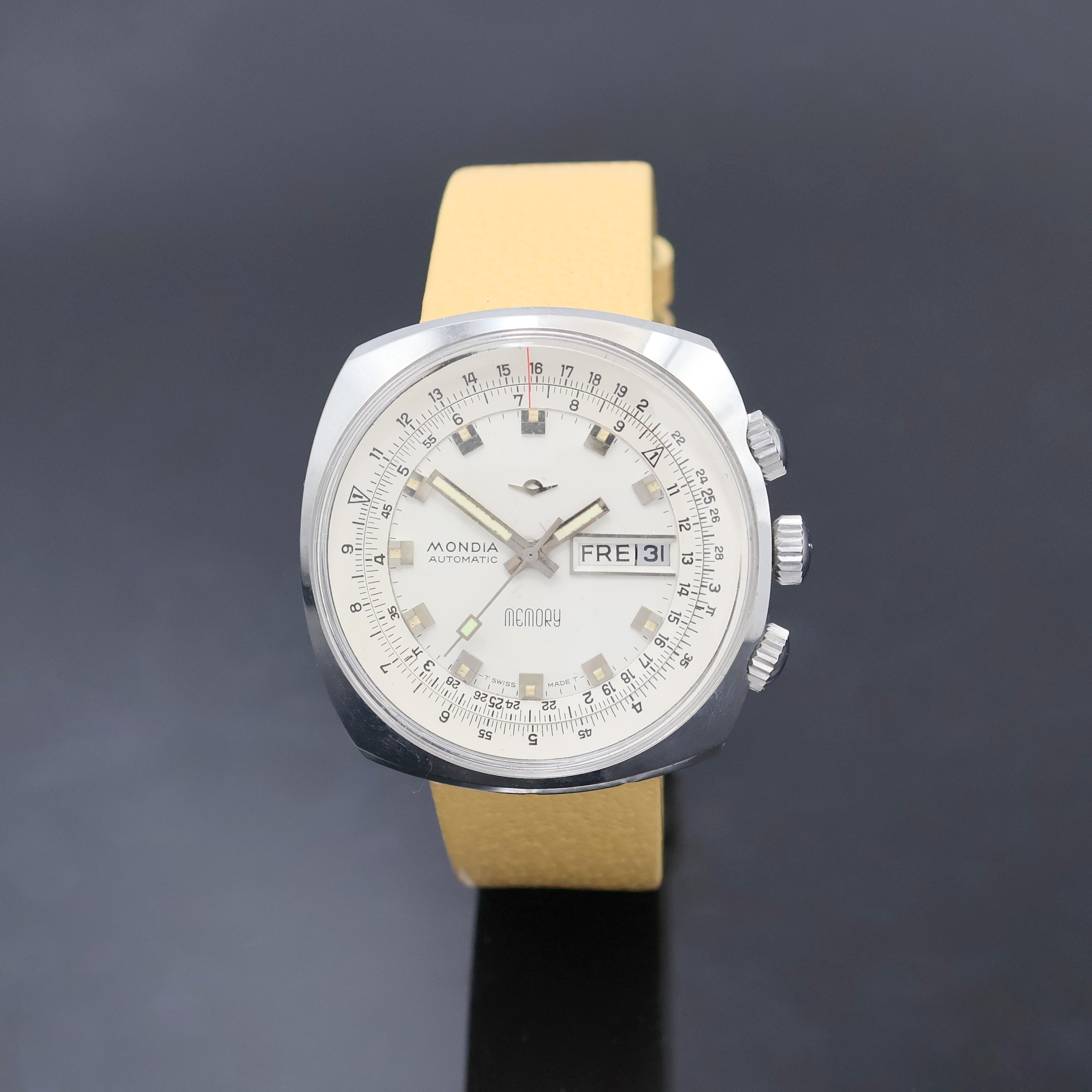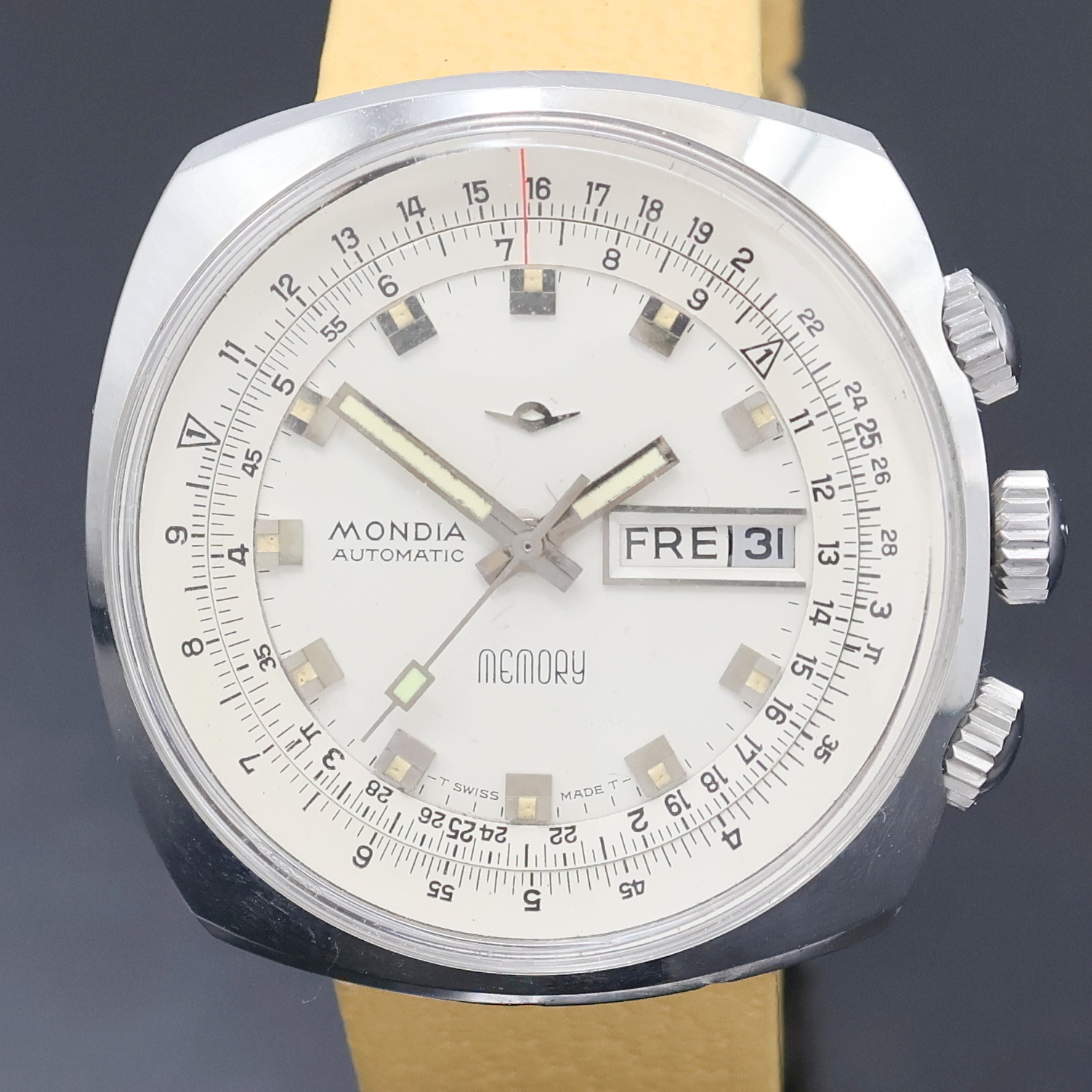 MONDIA Memory sehr seltene Armbanduhr mit Rechenschieber und rückseitiger Weltzeit,