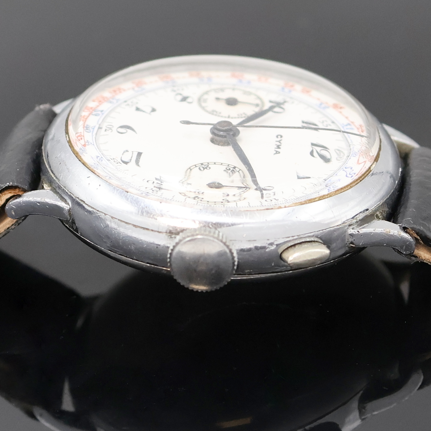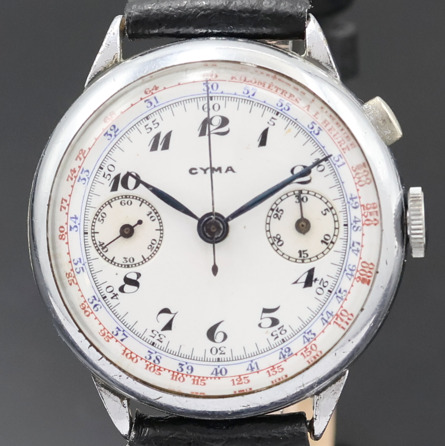CYMA früher Eindrücker-Schaltradchronograph, Schweiz m 1930, Handaufzug, verchr.