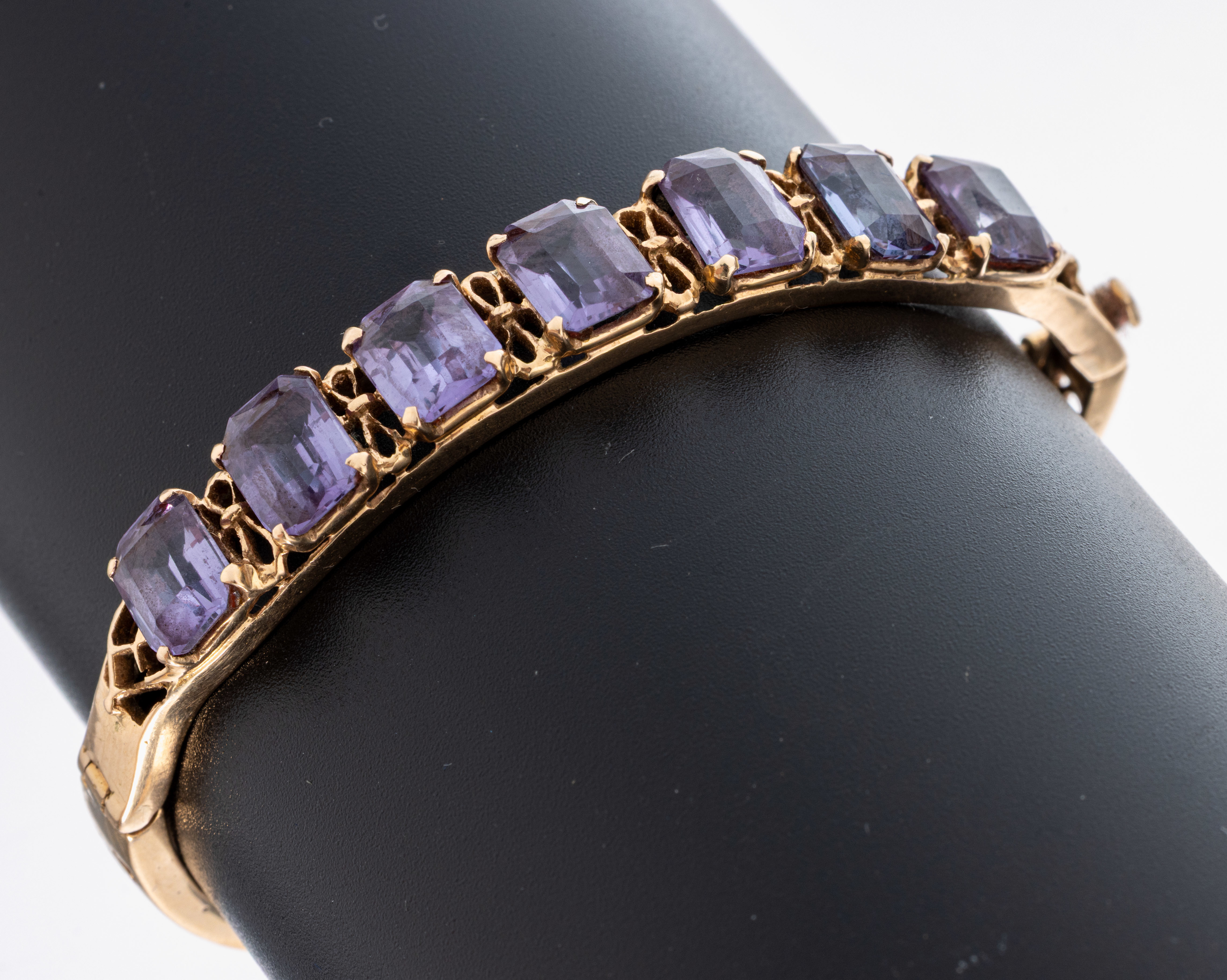 14 kt Gold Farbstein-Armreif, GG 585/000, 7synth. Korunde, D. ca. 5.4 x 4.4 cm, Klappscharnier,