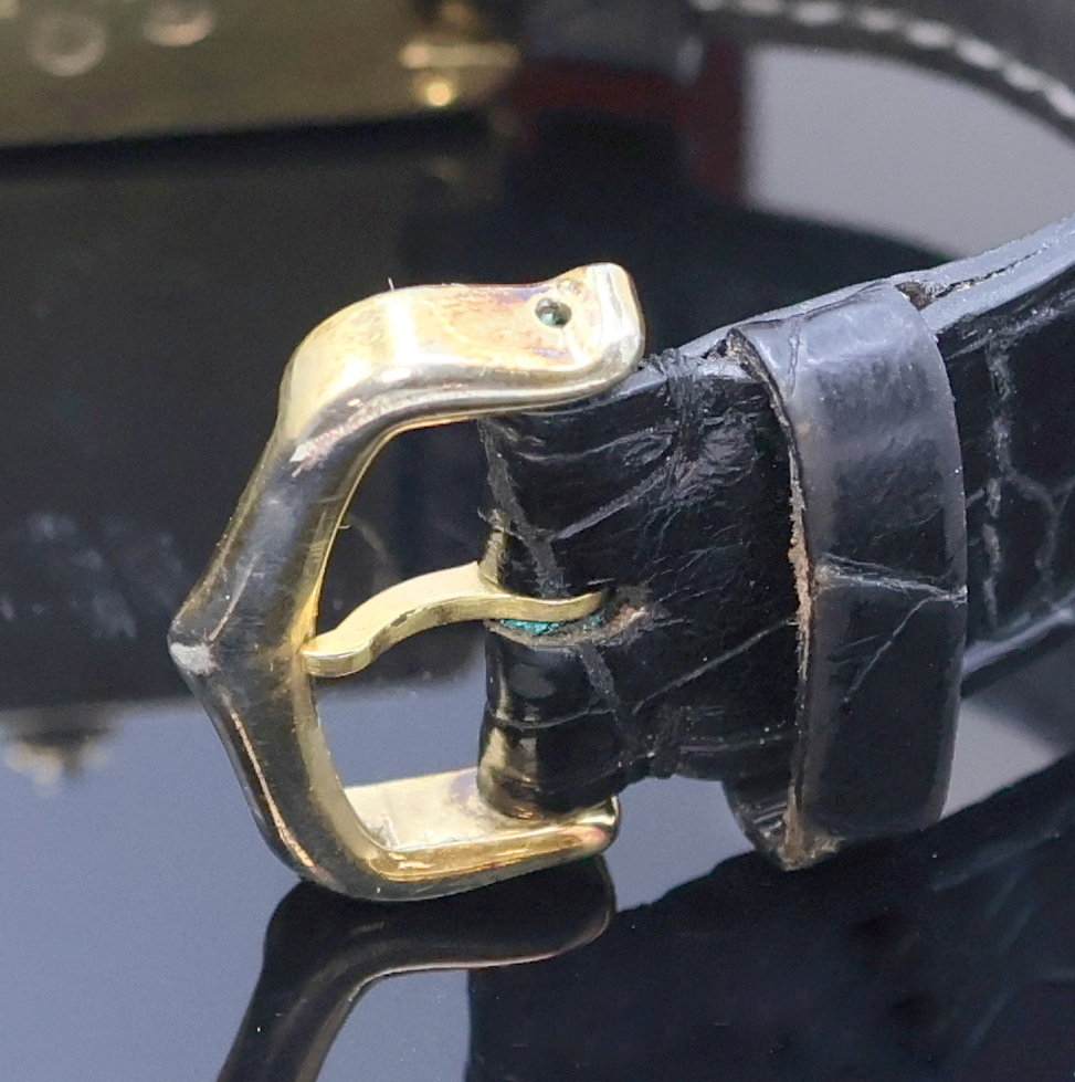 um 1990, quarz, Boden 4-fach verschr., orig. Lederband m. Dornschl., Schmuckkrone,