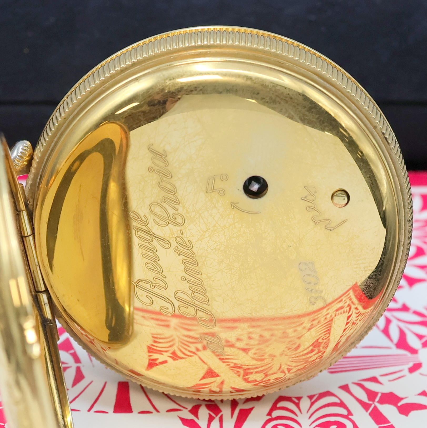REUGE Taschenuhr mit Wecker-Spieluhr und Figurenautomat, Schweiz um 1990, verg. Geh.,