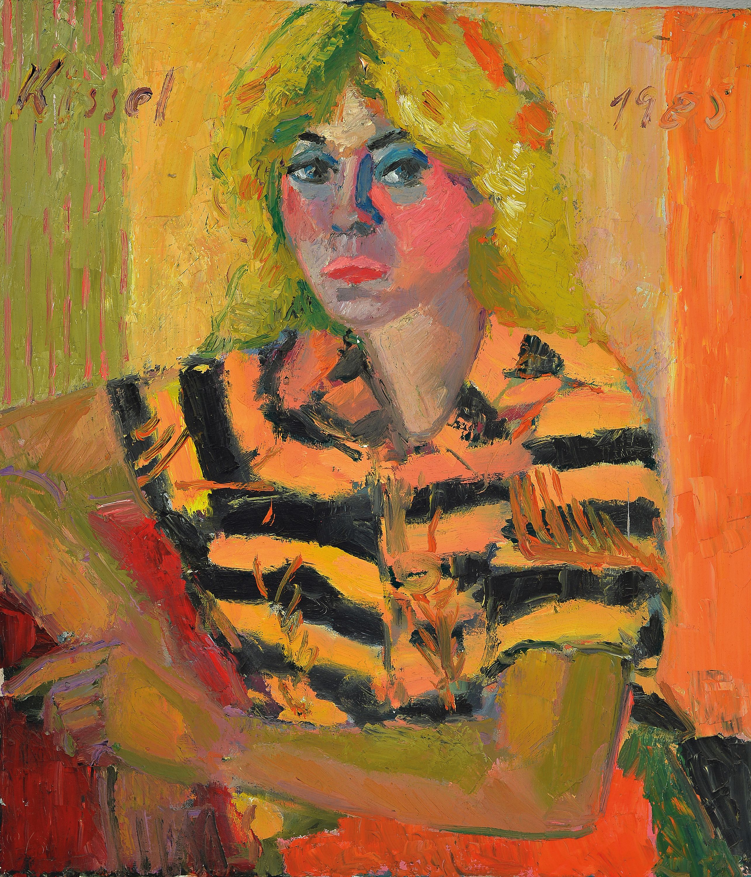 Gernot Kissel, 1939 Worms-2008 Römerberg, Frauenporträt, blonde Frau mit schwarz-gelb gestreifter Bluse, 1985 signiert und datiert, ungerahmt 80x70 cm