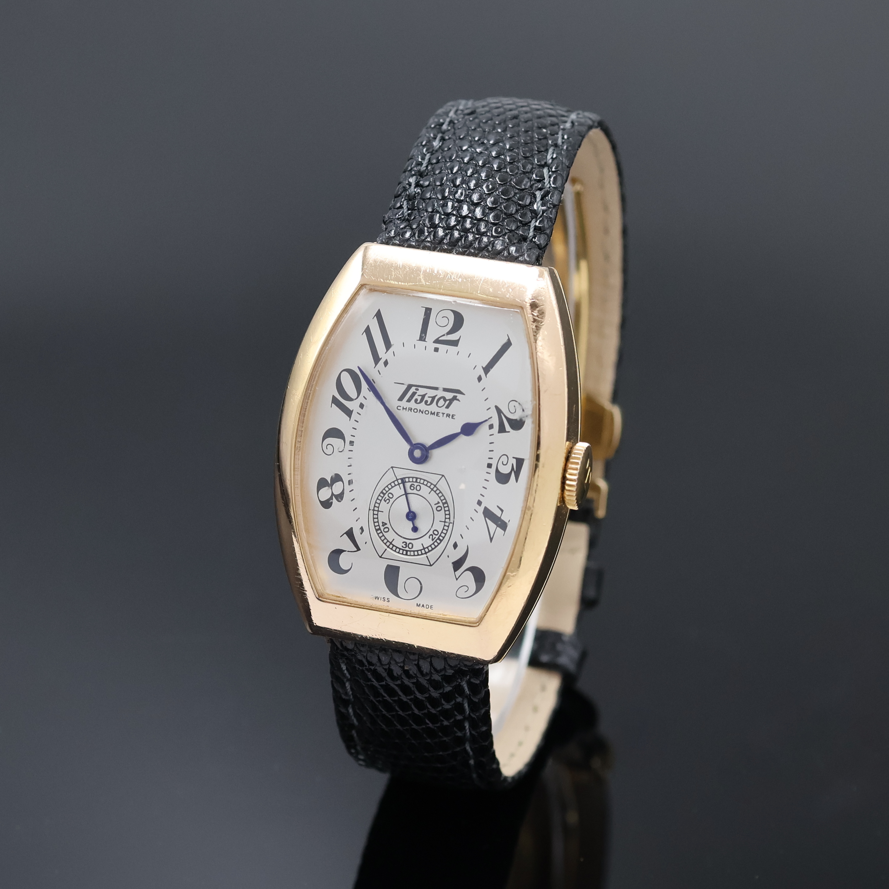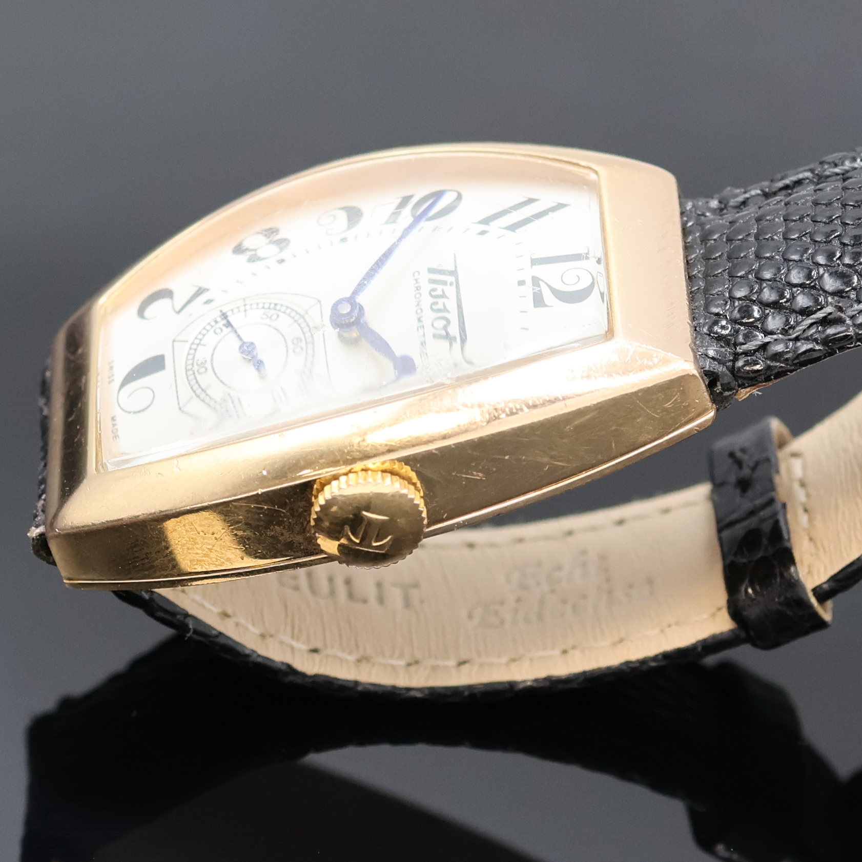 TISSOT seltene, auf 666 Stück Chronometer Herrenarmbanduhr Porto in RG 750/000, Schweiz um 2000, Handaufzug, tonneauförmiges Geh., Lederband m. verg. Faltschl., vers. Zifferbl. m. arab. Std, gebl. Zeiger, Boden 8 -fach verschr., Basiskal. Peseux 7001, 17 St.,stoßges., unter Chronometerbed. just., M. ca.42,5 x 31,5 mm, Nutzsp. altersbed., Glas zu ern., EZG 2-3, EZW 2, aus Sammlungsauflösung