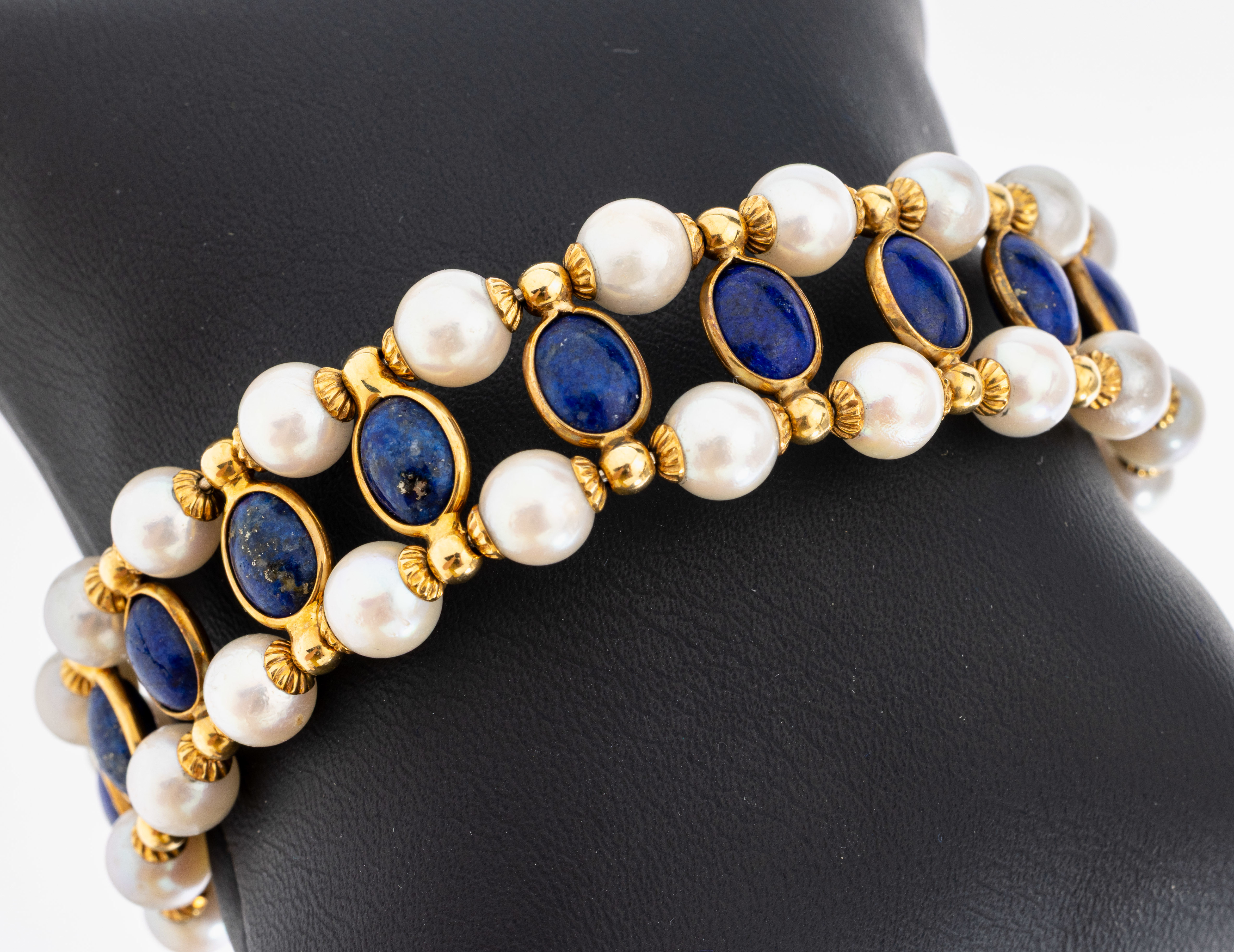 18 kt Gold Perl-Lapislazuli-Armreif, GG 750/000, weiße Zuchtperlen, Lapislazuli-