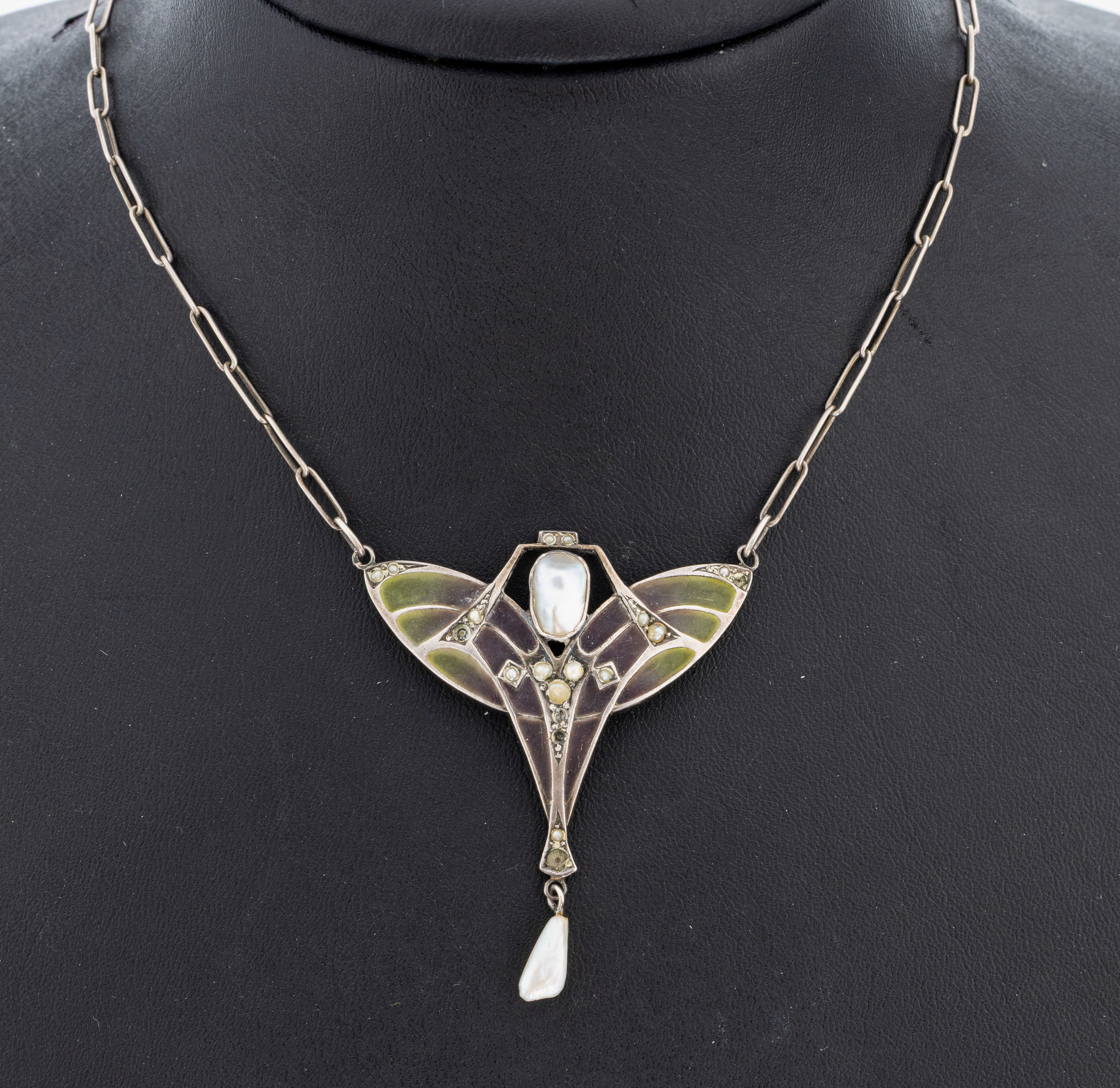 Jugendstil Fensteremail-Perl-Collier, wohl Frankreich um 1900, Silber gepr., abstrakt