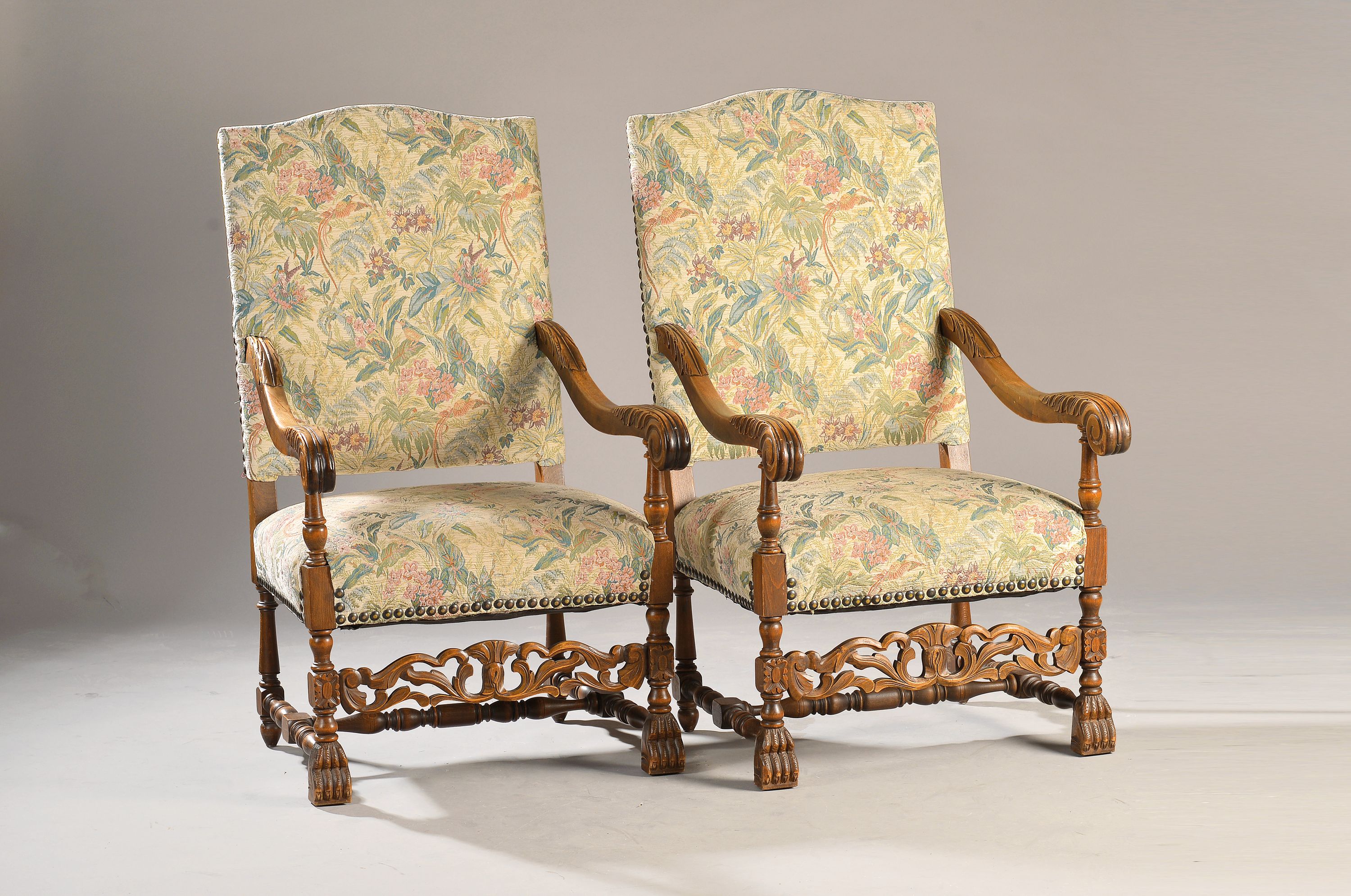 2 Armlehnsessel, deutsch, um 1880-90, Eiche geschnitzt und z.T. gedrechselt, Gobelinbezug,