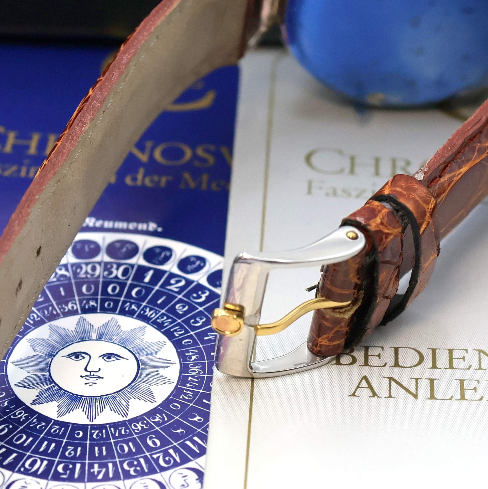 seitl. im Geh. eingel., neutr. Lederband m. orig. Dornschl., weißes Zifferbl. m.