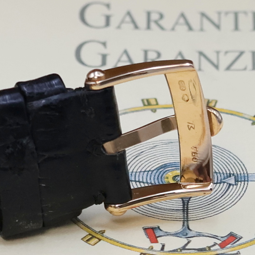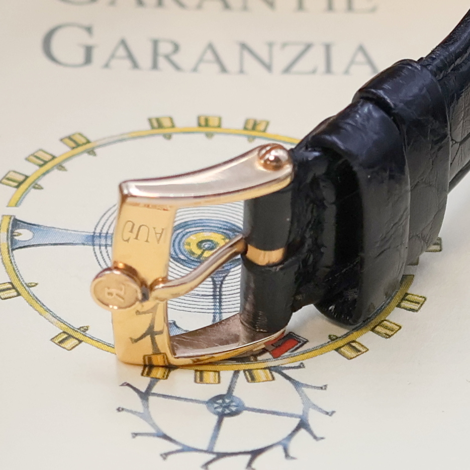Lederband m. RoseG 750/000 Dornschl., schwarzes Zifferbl. m. aufges. rotgold. Std.-Ind.,