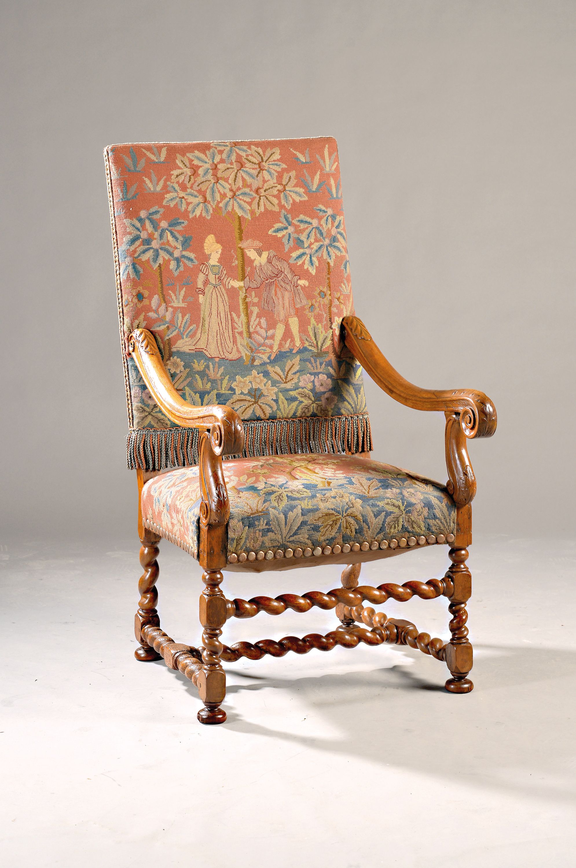 Armlehnstuhl, Barock, erste Hälfte 18. Jh., Nussbaum massiv, gedrechselte Beine,