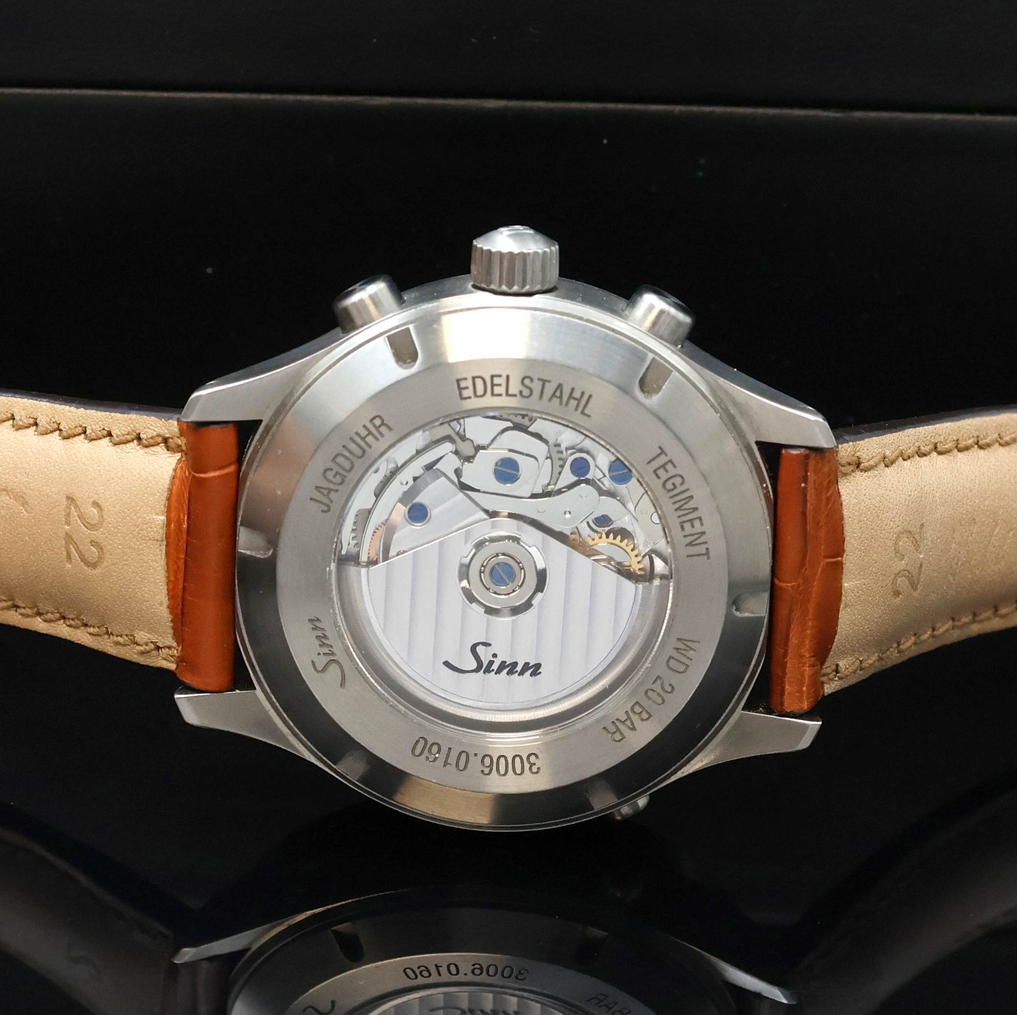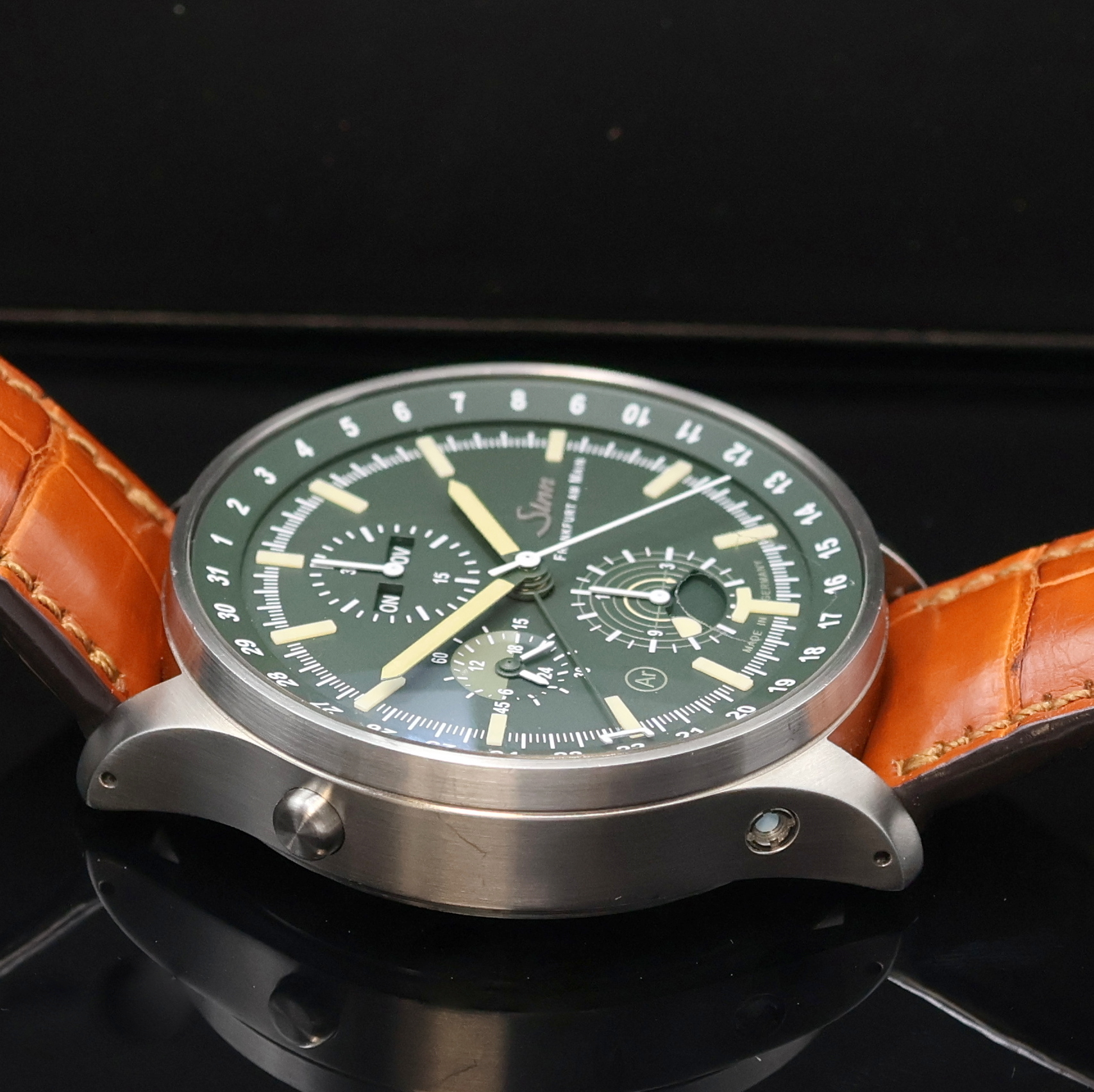 SINN Armbandchronograph Jagduhr Referenz 3006, Automatik, Deutschland/Schweiz um 2020, beids. vergl. Edelstahlgeh. inkl. orig. Lederband m. orig. Dornschl., Boden und Krone verschr., dunkelgrünes Zifferblatt mit Nachtleuchtfarbe, Anz. v. Std., Min., kl. Sek., Tag, Datum, Monat, Mondlicht, Tag/Nacht und Chronographenz., AR Trockenhaltekapsel im Geh.eingel., Werk rhod., 25 St., Kal. C99002, D. ca. 44 mm, orig. Etui, EZ 1-2