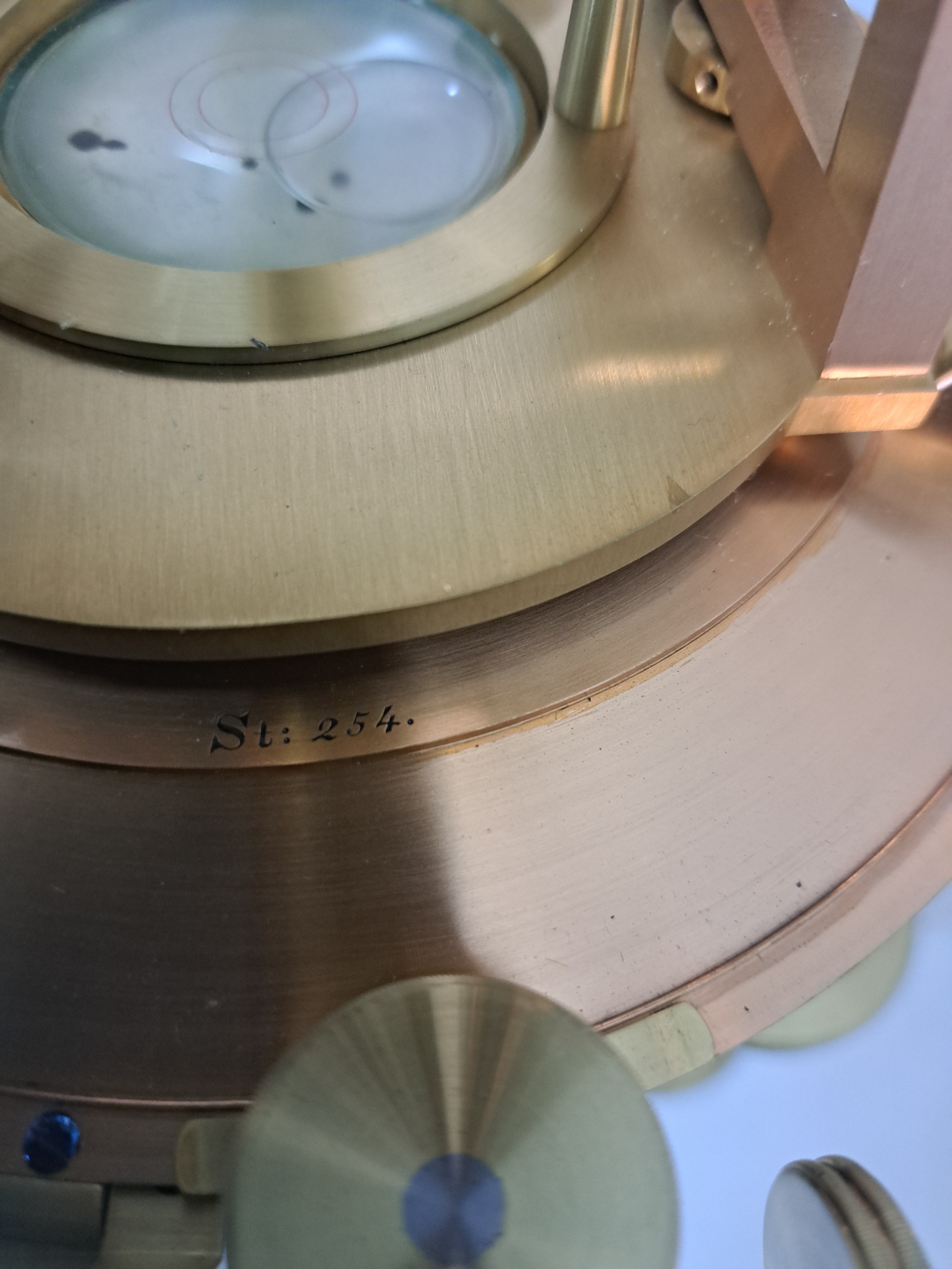 Zustand. Höhenverstellbar, graviert. Dazu passende Schauvitrine mit kleinem Postament.