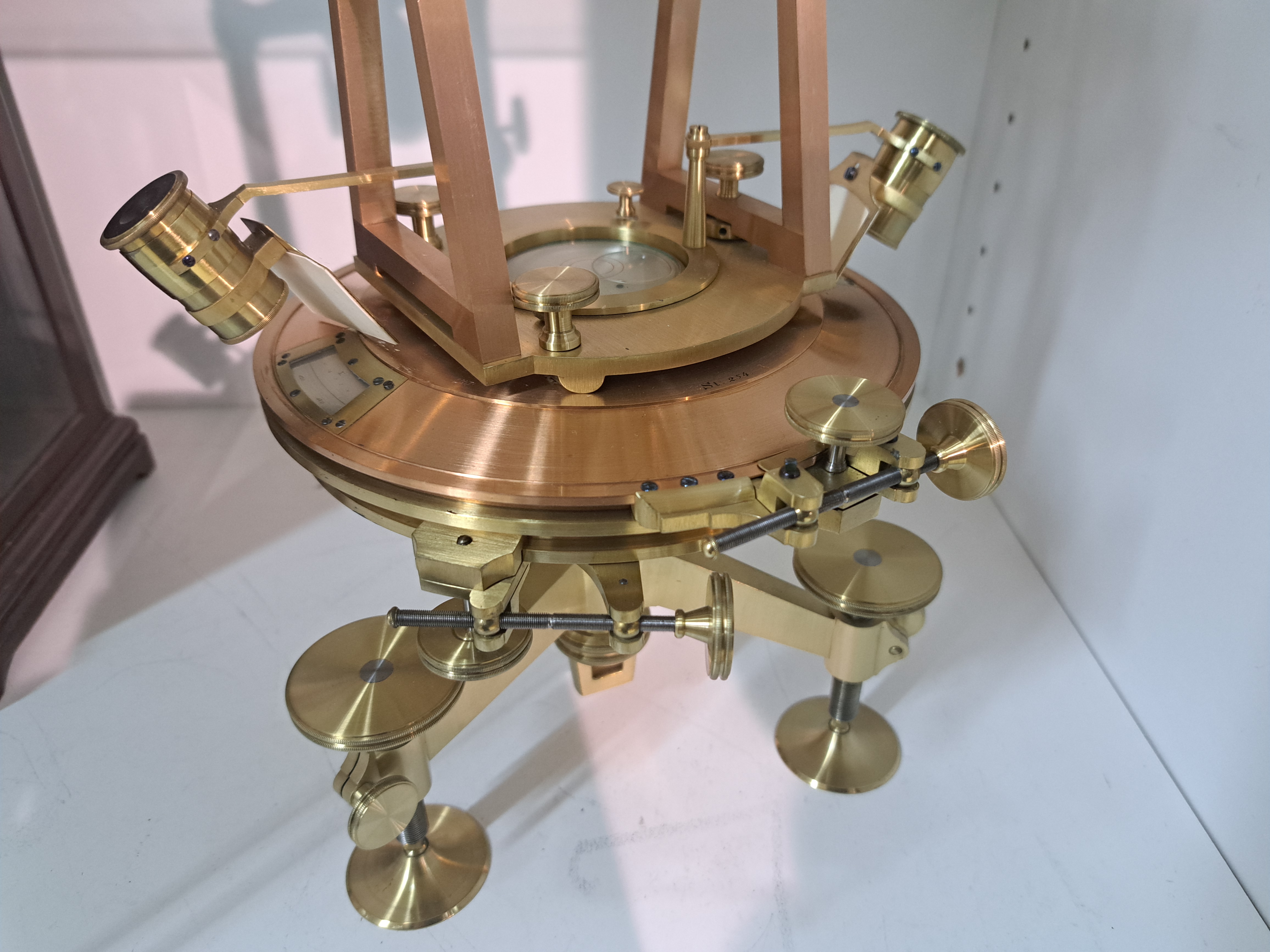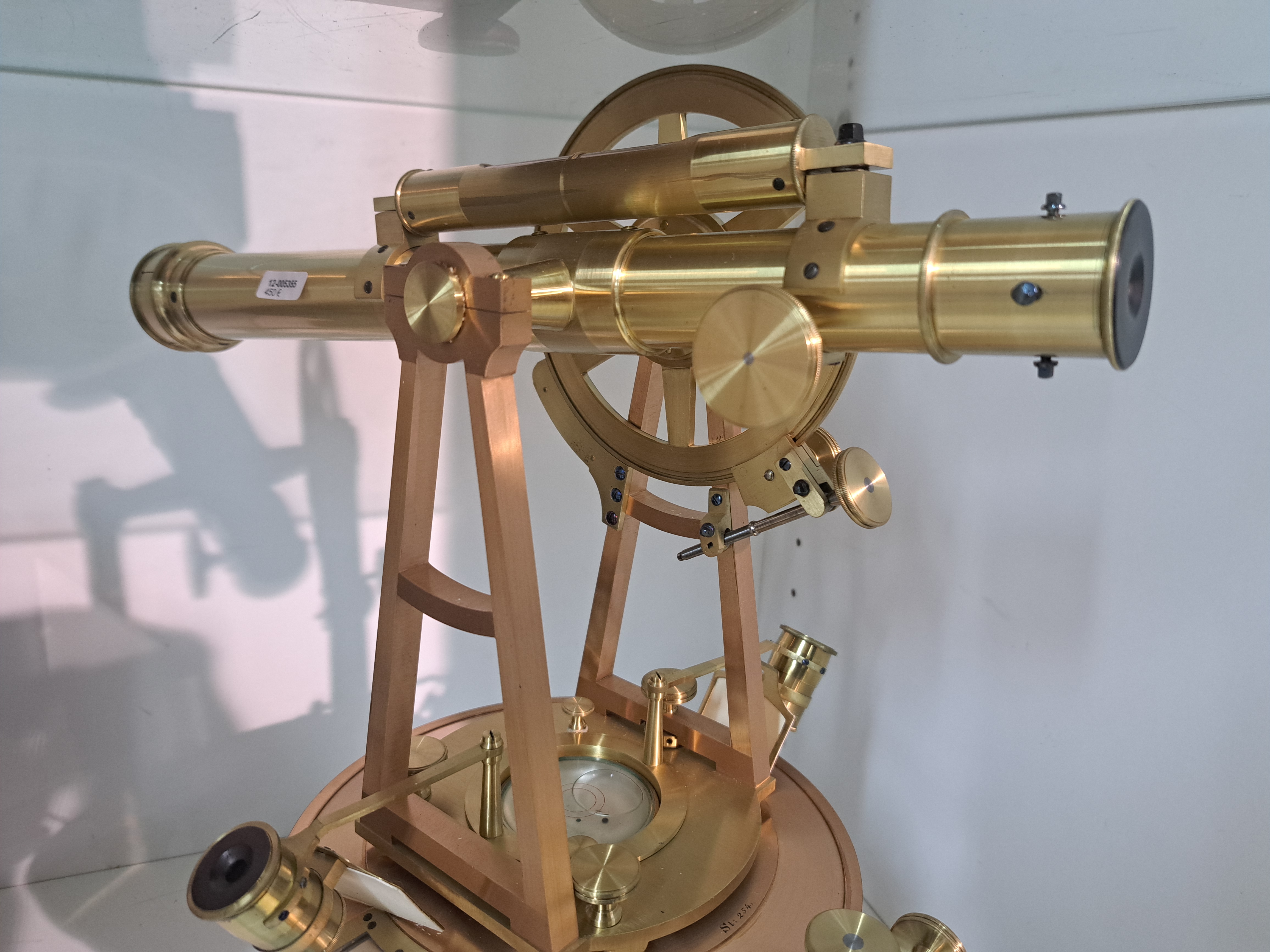 Beleuchtbar. Höhe Theodolith ca. 19.5cm, Vitrine: 86x47.5x38cm Gewicht ca. 7kg.