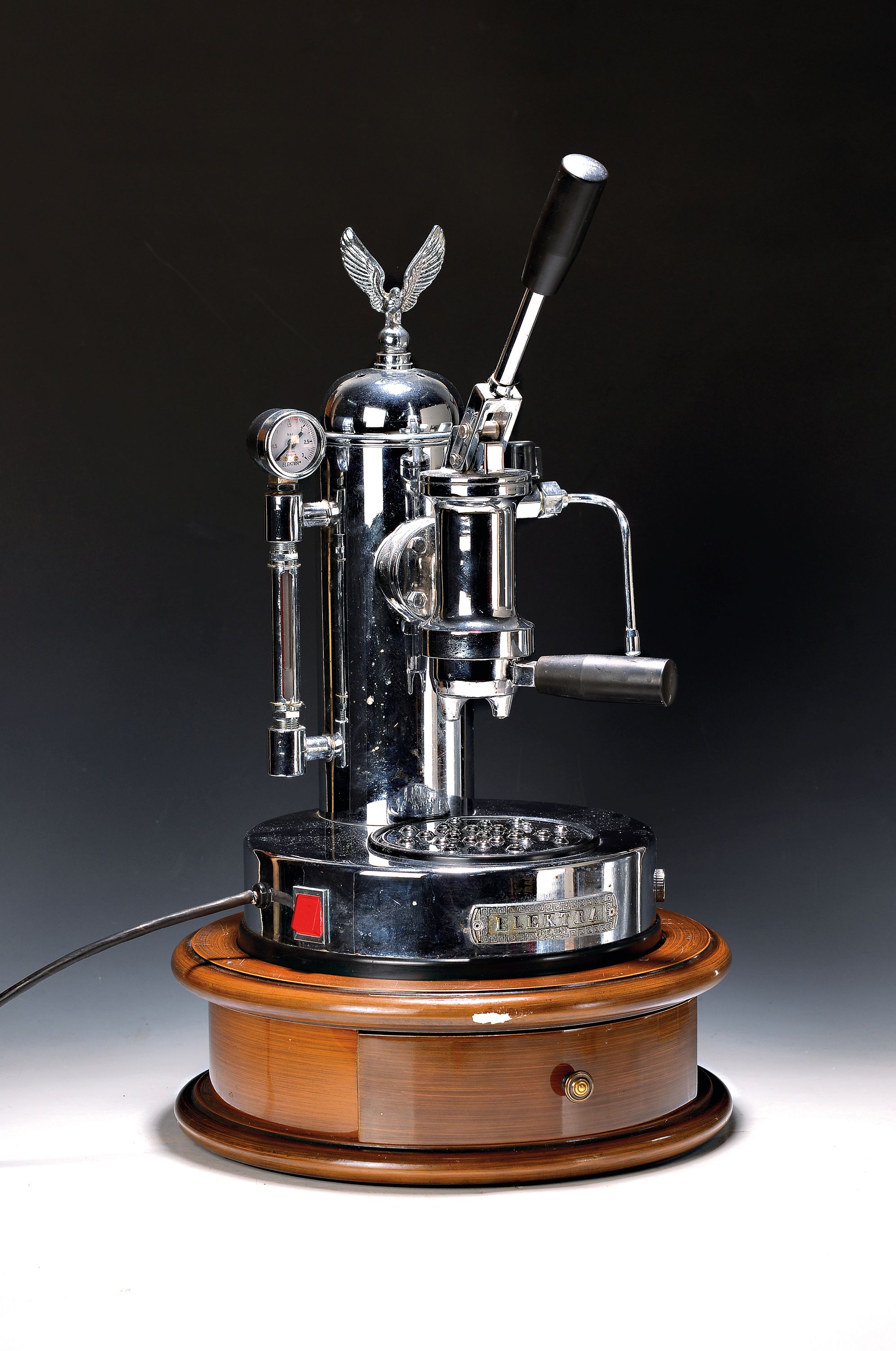 Elektra Chrom, auf rundem Holzsockel mit Schublade stehend, Höhe komplett ca. 62cm,