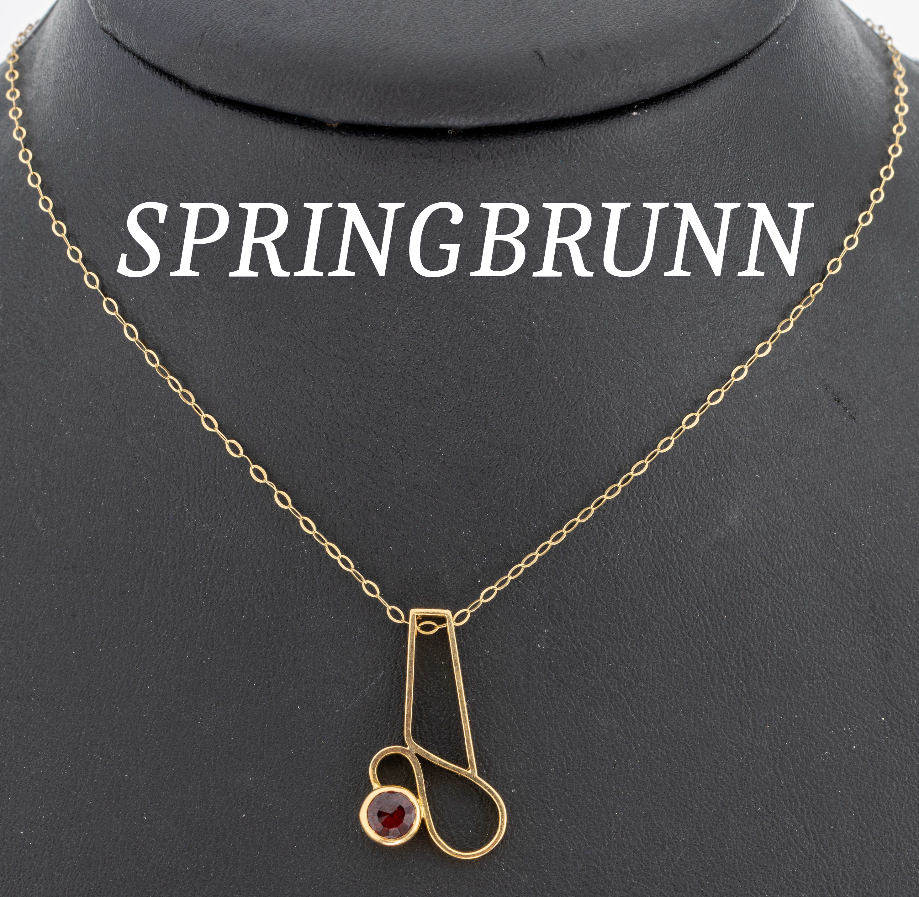 18 kt Gold Granat-Anhänger, GG 750/000, geschwungen, rundfacett. Granat, an Kette,