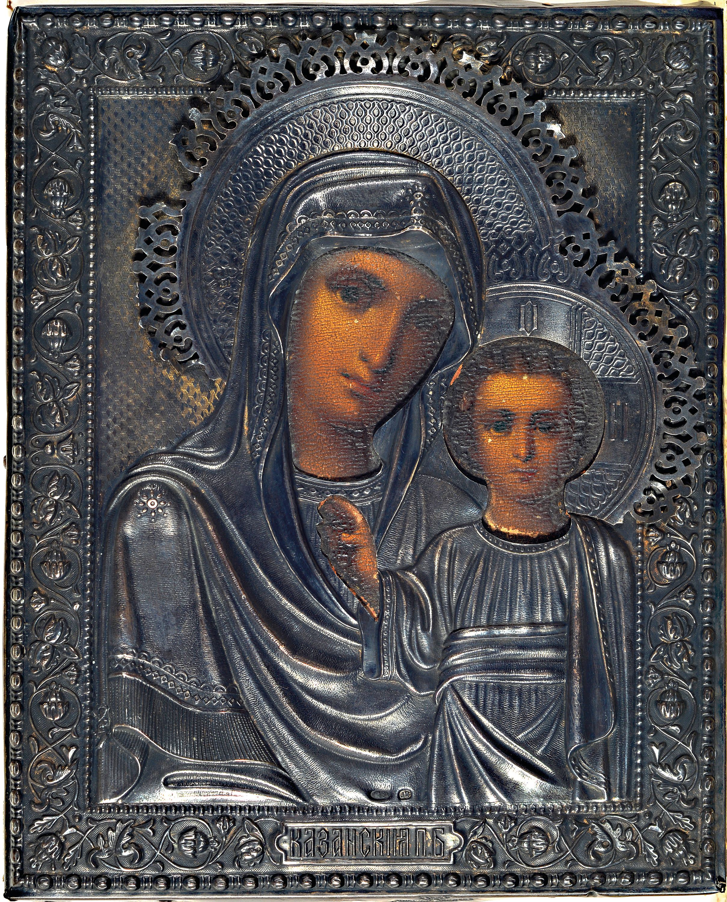 Ikone, Russland, 19. Jh., mit Silberoklad, Gottesmutter von Kazan, getriebenes Silberoklad,