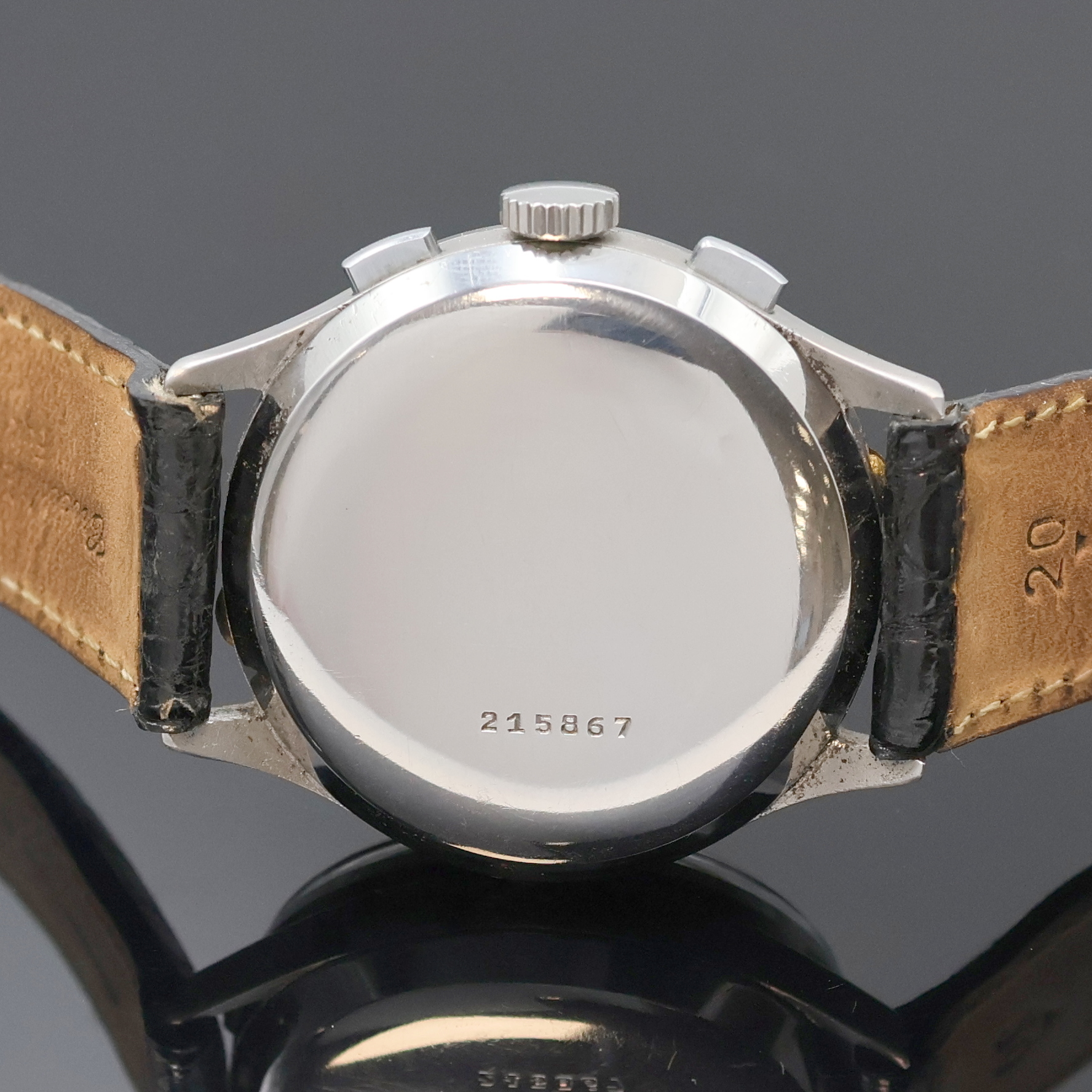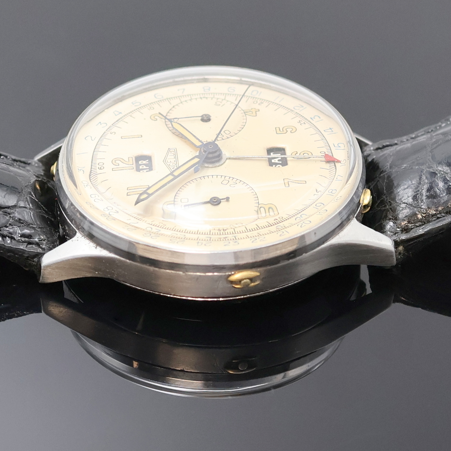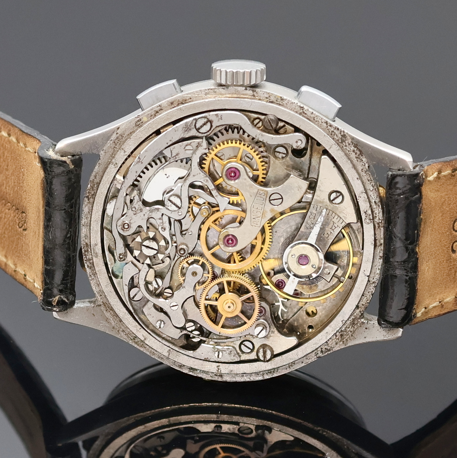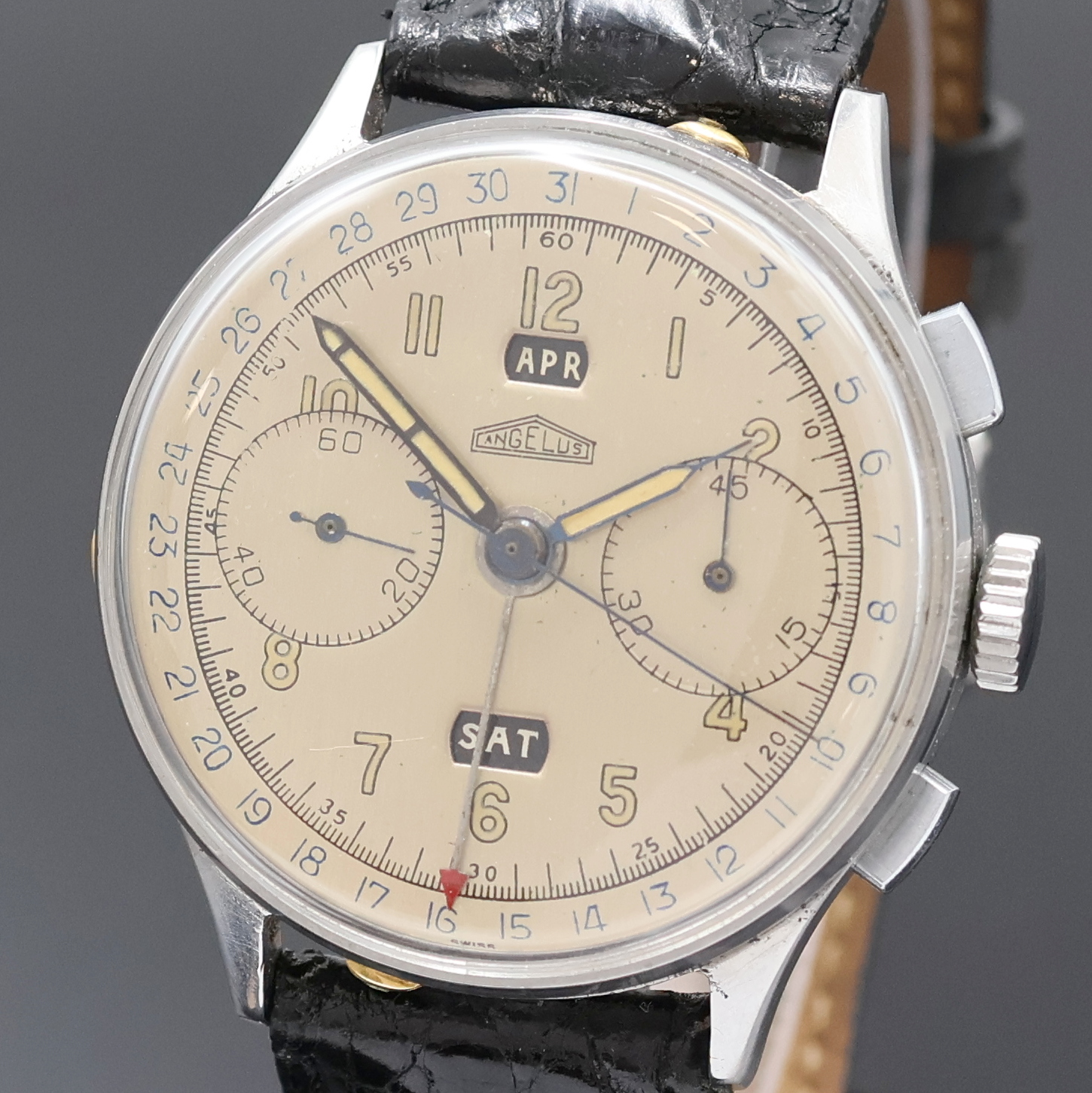 ANGELUS Schaltradchronograph Chronodato, Schweiz 1940er Jahre, Handaufzug, unsign. Edelstahlgeh., Boden und Glasrand aufgedr., vers. Zifferblatt rest., Anz. v. Std., Min., kl. Sek., Tag, Datum u. Monat, Korrekturdr. im Geh. eingel., 17 St., Basiskal. 215, Schr.- Unr., Breg.-Spir., noch ohne Stoßs., Nutzsp. altersbed., Überh. empf., EZ 2-3, aus Sammlungsauflösung