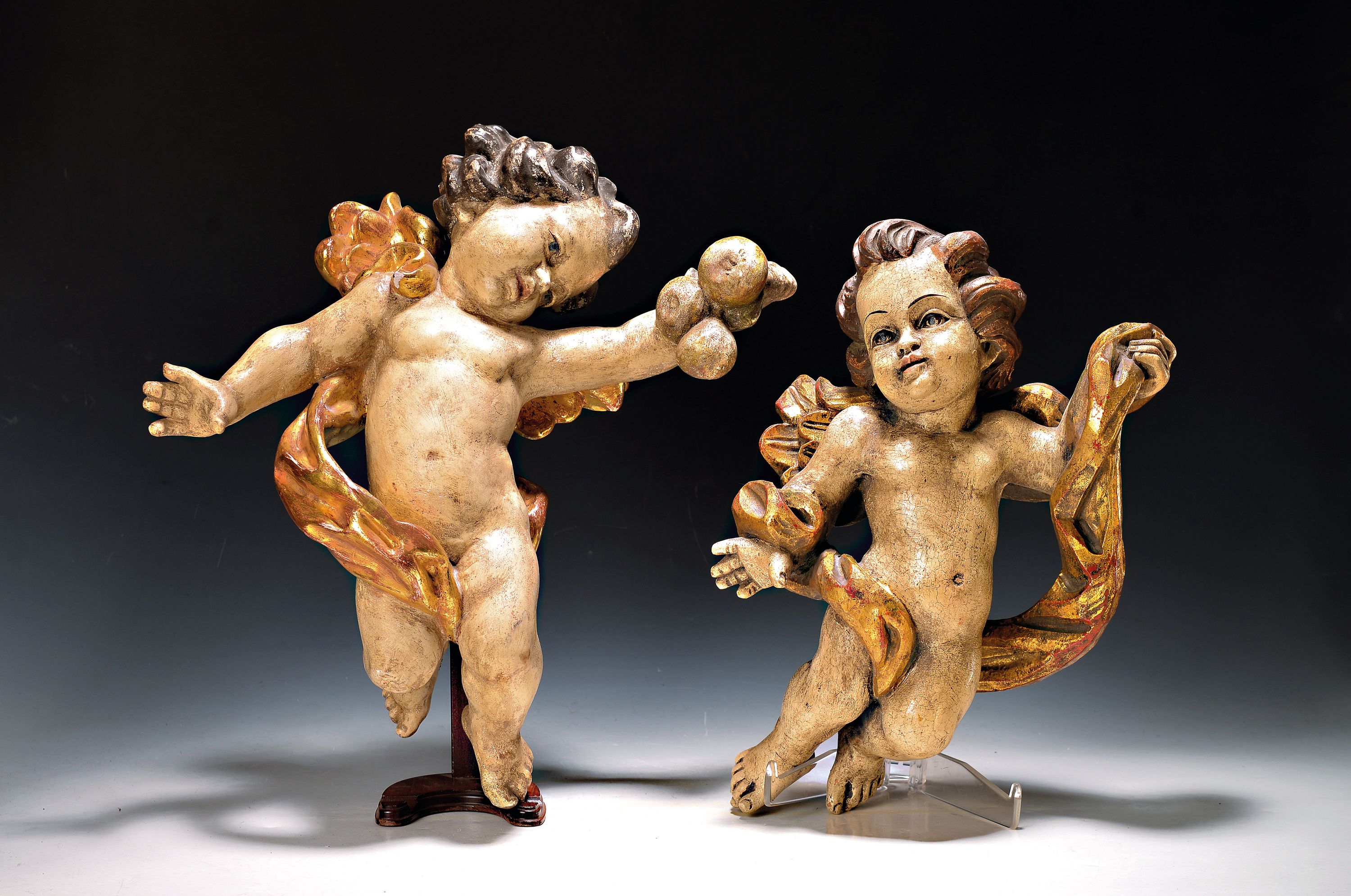 2 Wandengel, wohl süddeutsch, 2. Hälfte 20. Jh., Holz geschnitzt und gefasst, z.T.