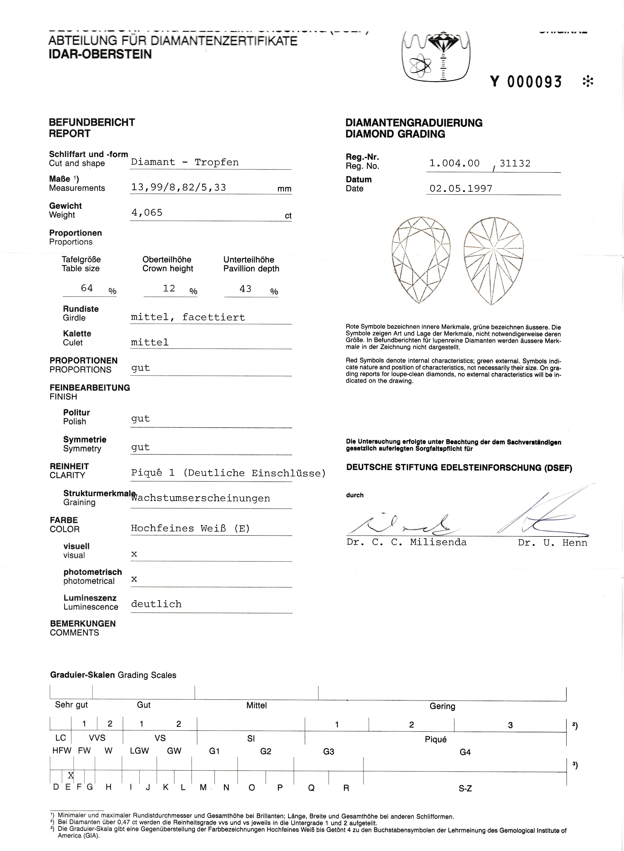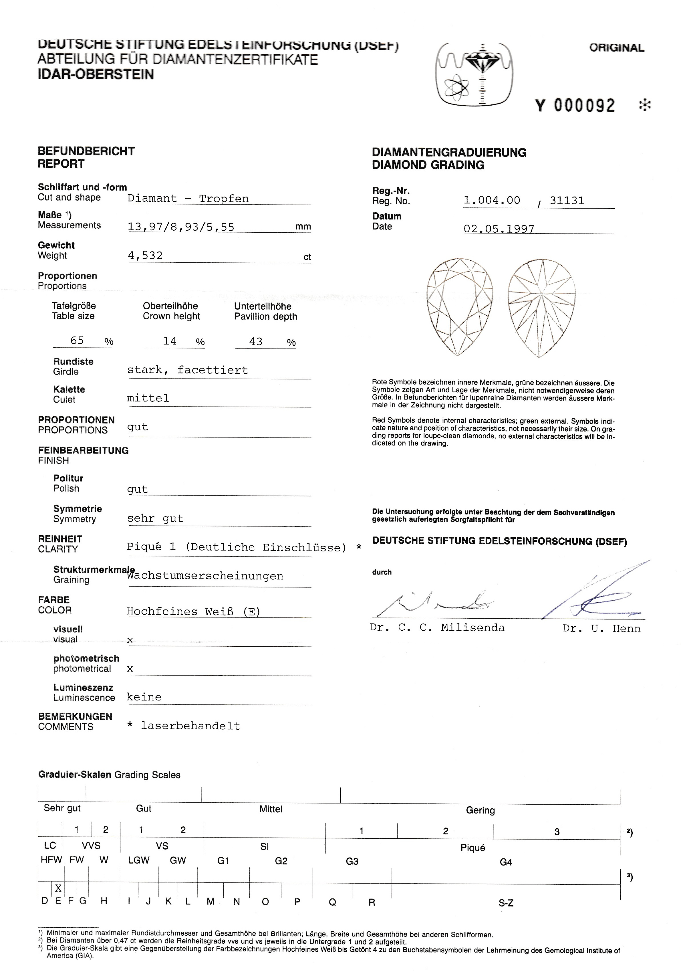 (E)/p1, und 1 Diamant-Tropfen 4.532 ct hochfeines Weiß(E)/p1 (laserbeh.), 2 Diamant-