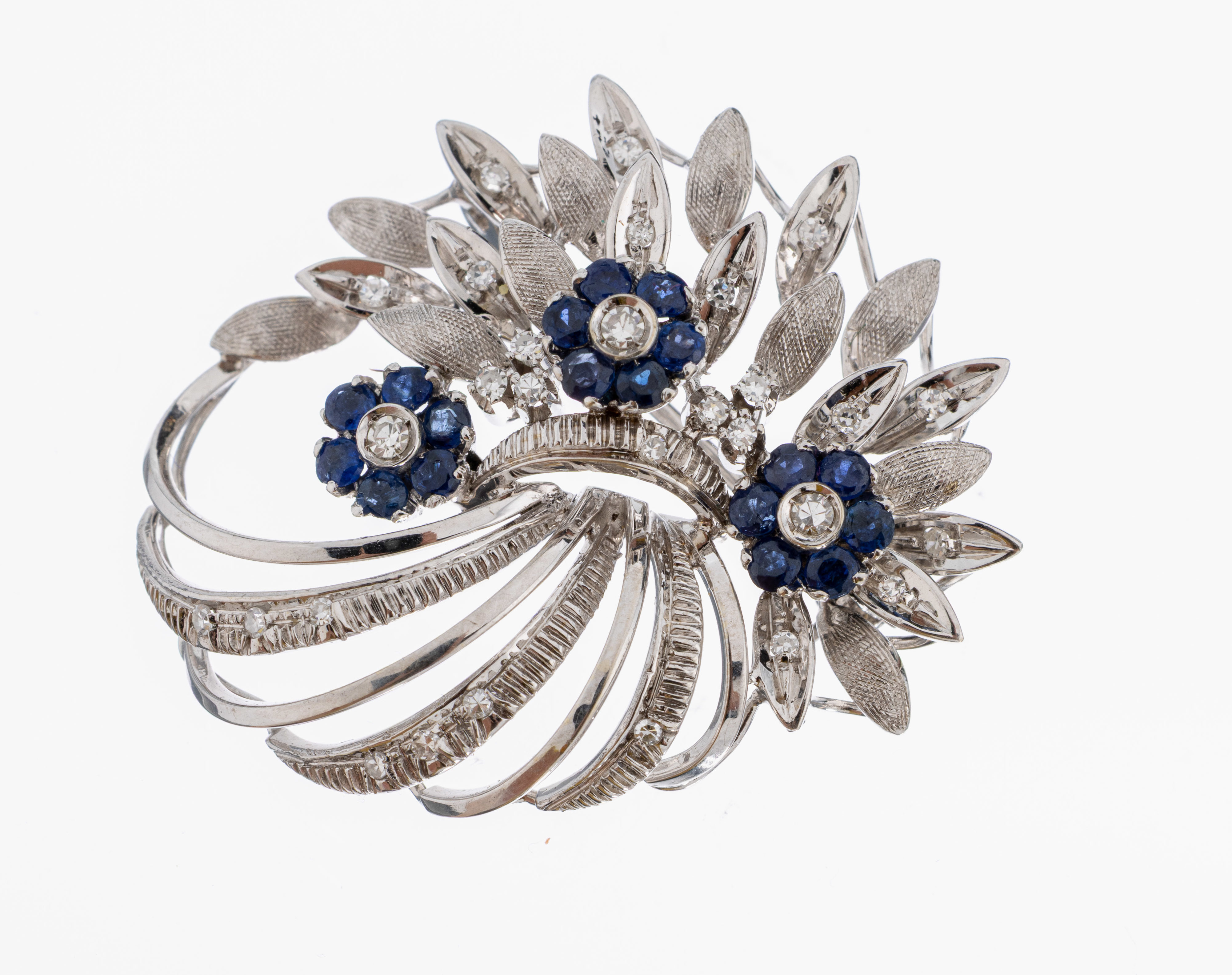 18 kt Gold Saphir-Diamant-Brosche, WG 750/000, 18 rundfacett. Saphiren zus. ca. 0.36ct,