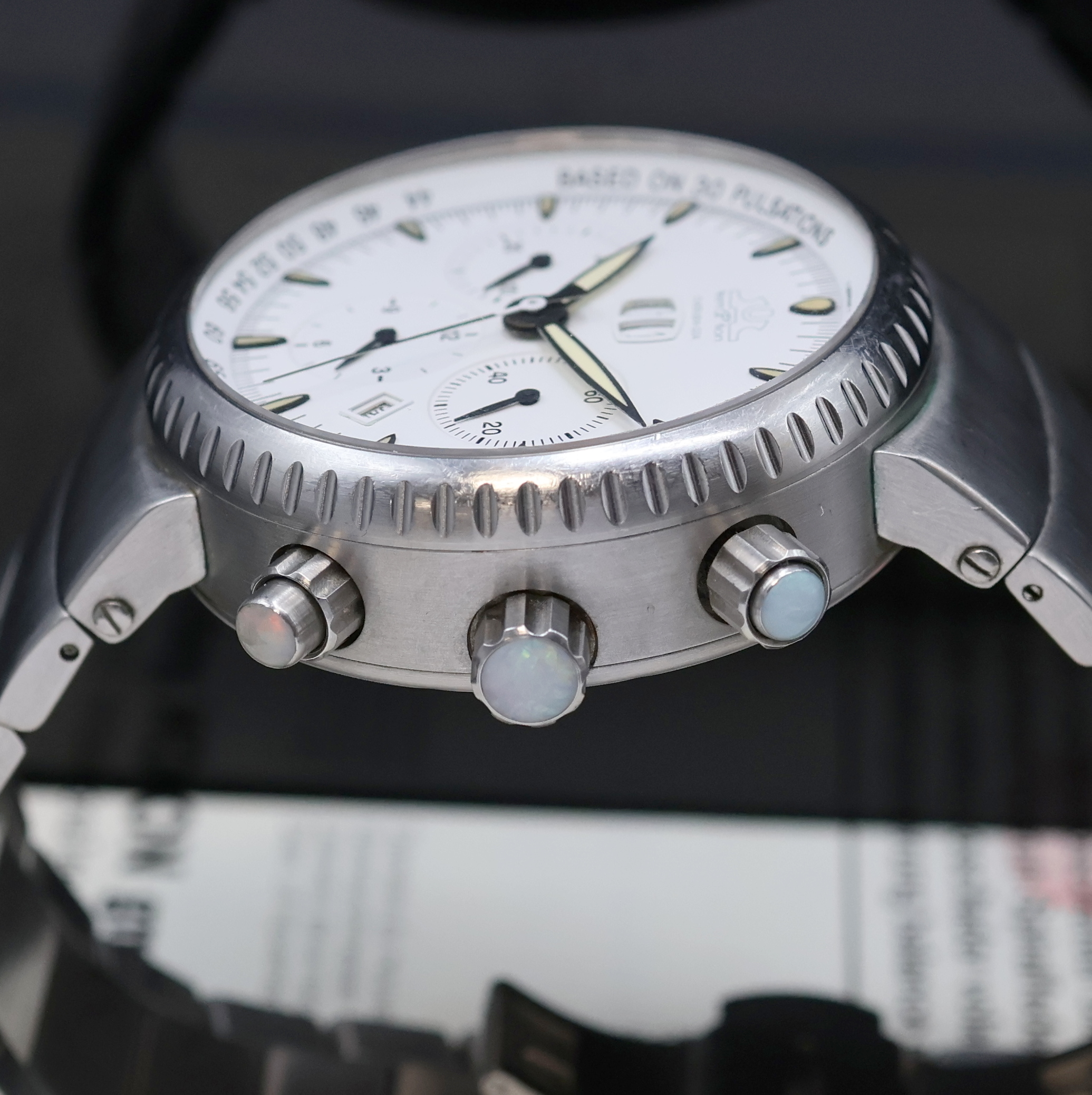 Saphirgl., Boden 7-fach verschr., Krone u. Drücker m. Opal verschr., weißes Zifferbl.