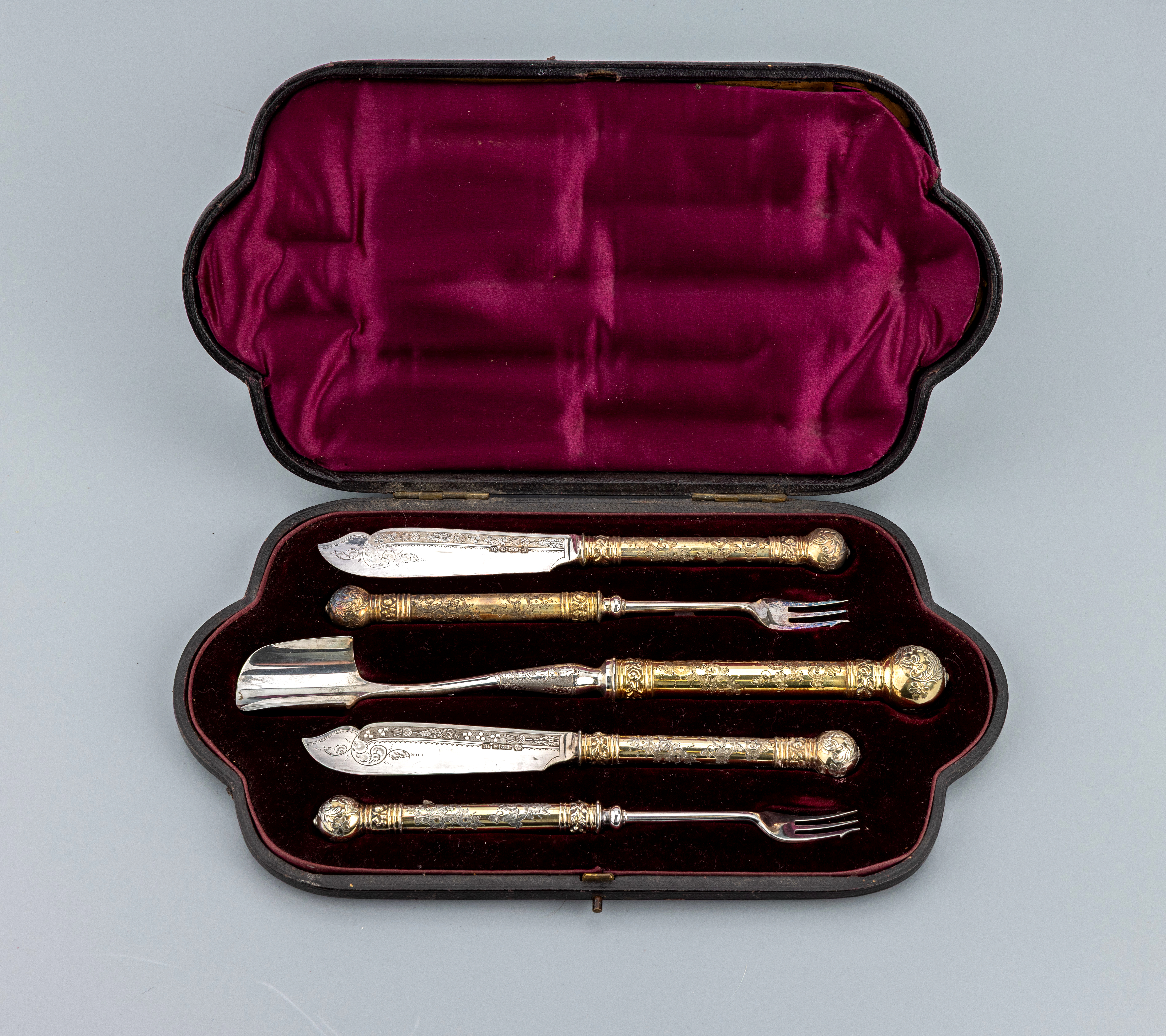 5-tlg. Käsebesteck, wohl England, um 1900, Metall versilbert und vergoldet, best.